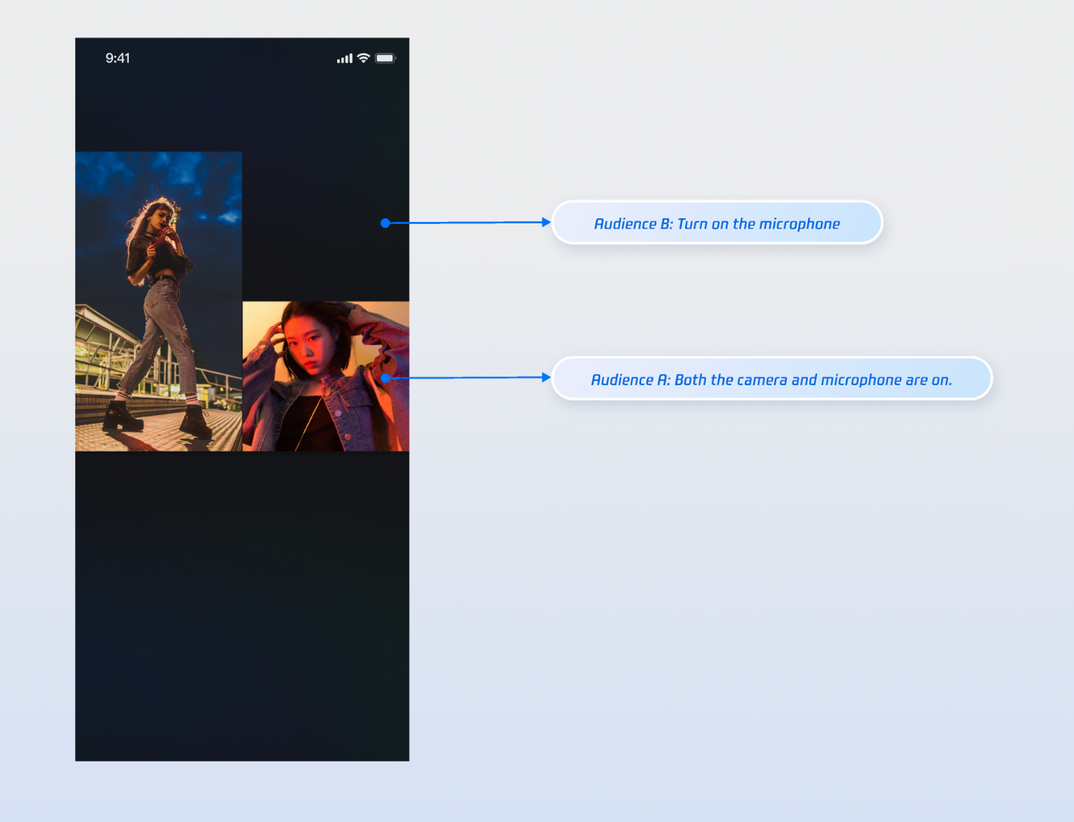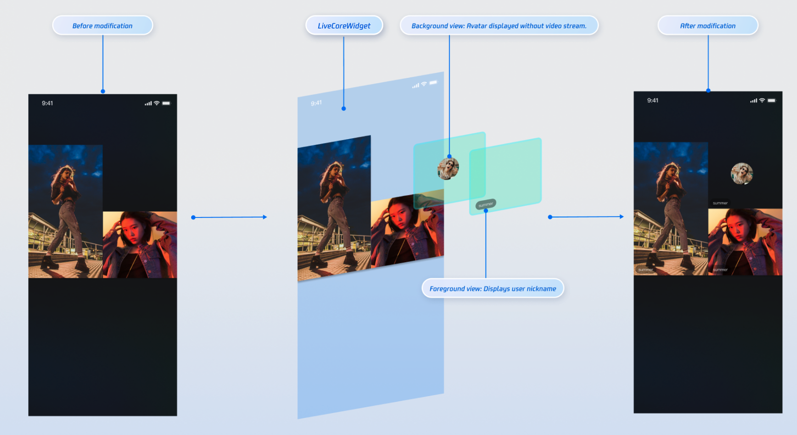 coGuestWidgetBuilder callback, so you don't need to handle them manually. If necessary to process user interaction (such as click events) in a custom view, just add corresponding event handling when creating the view.ViewLayer is used to distinguish between foreground and background widgets.ViewLayer.foreground: The foreground layer, always displayed on top of the video image.ViewLayer.background: The background layer, displayed only when the corresponding user has no video stream (for example, when the camera is not turned on), usually used for displaying the default avatar or placeholder image of the user.LiveCoreWidget's videoWidgetBuilder parameter is correctly set.coGuestWidgetBuilder callback function is correctly implemented.Widget instance.Feedback