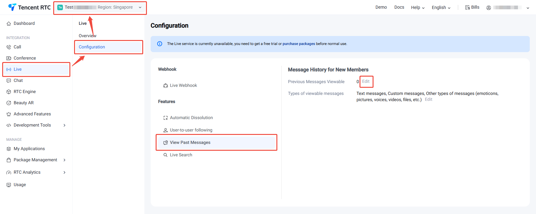 1. Log in to the console > Live > Configuration, and select the target application at the top.