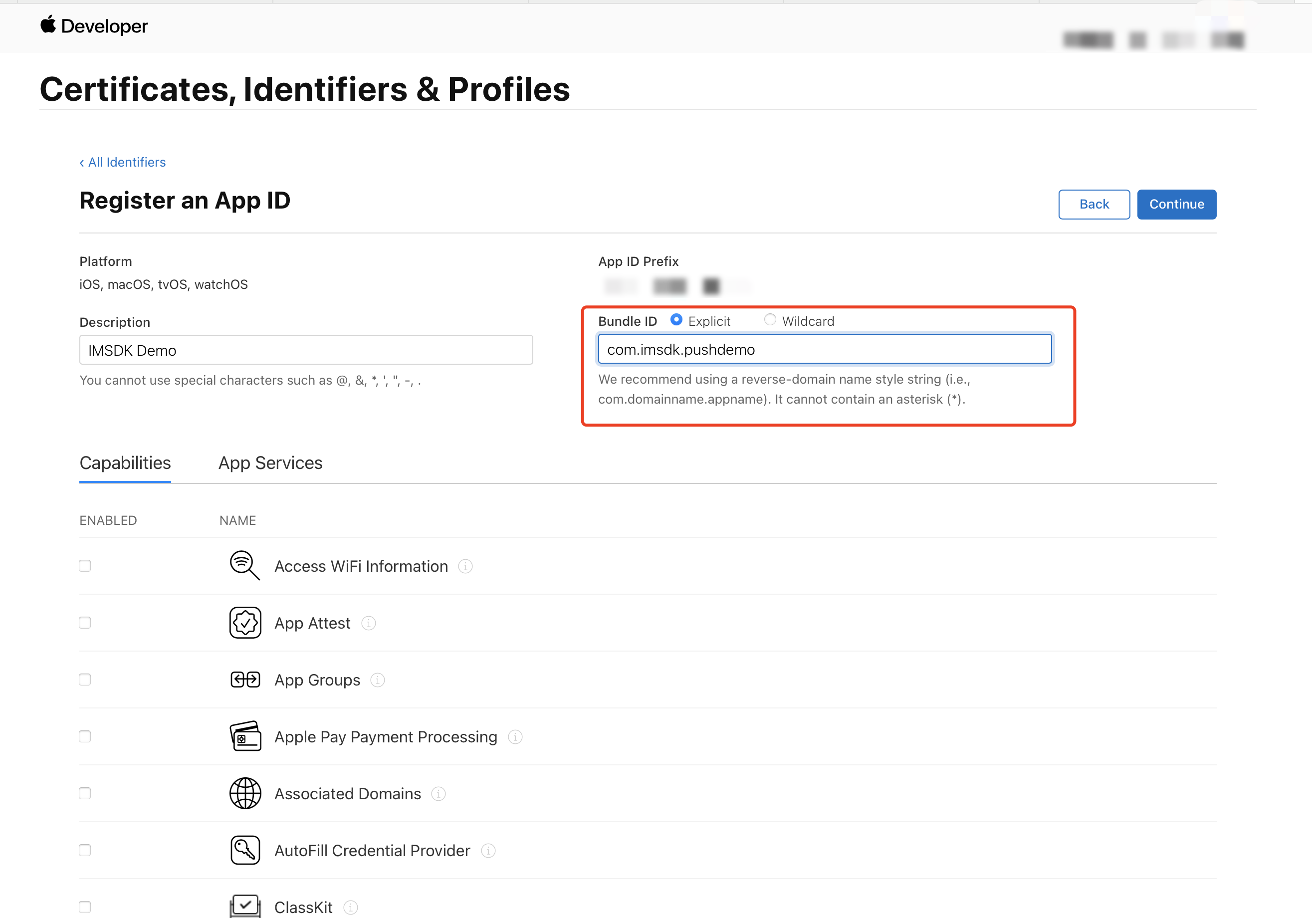 6. Configure the Bundle ID and other required fields, then click Continue.