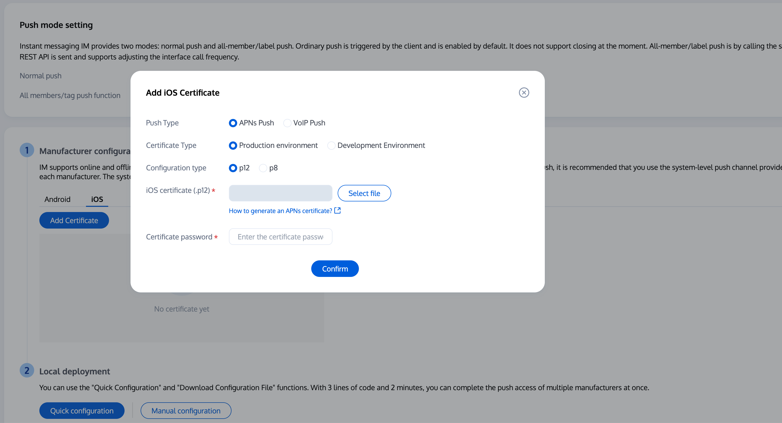 Upload the iOS APNs push certificate you obtained to the Chat Console.