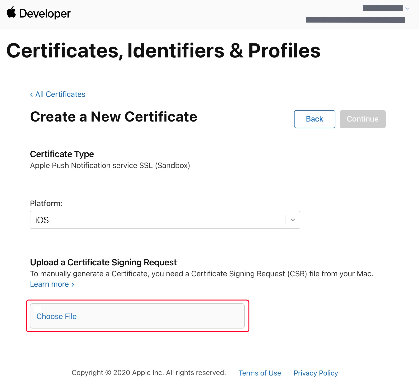 6. Return to the Apple Developer website, click Choose File to upload the generated *.certSigningRequest.