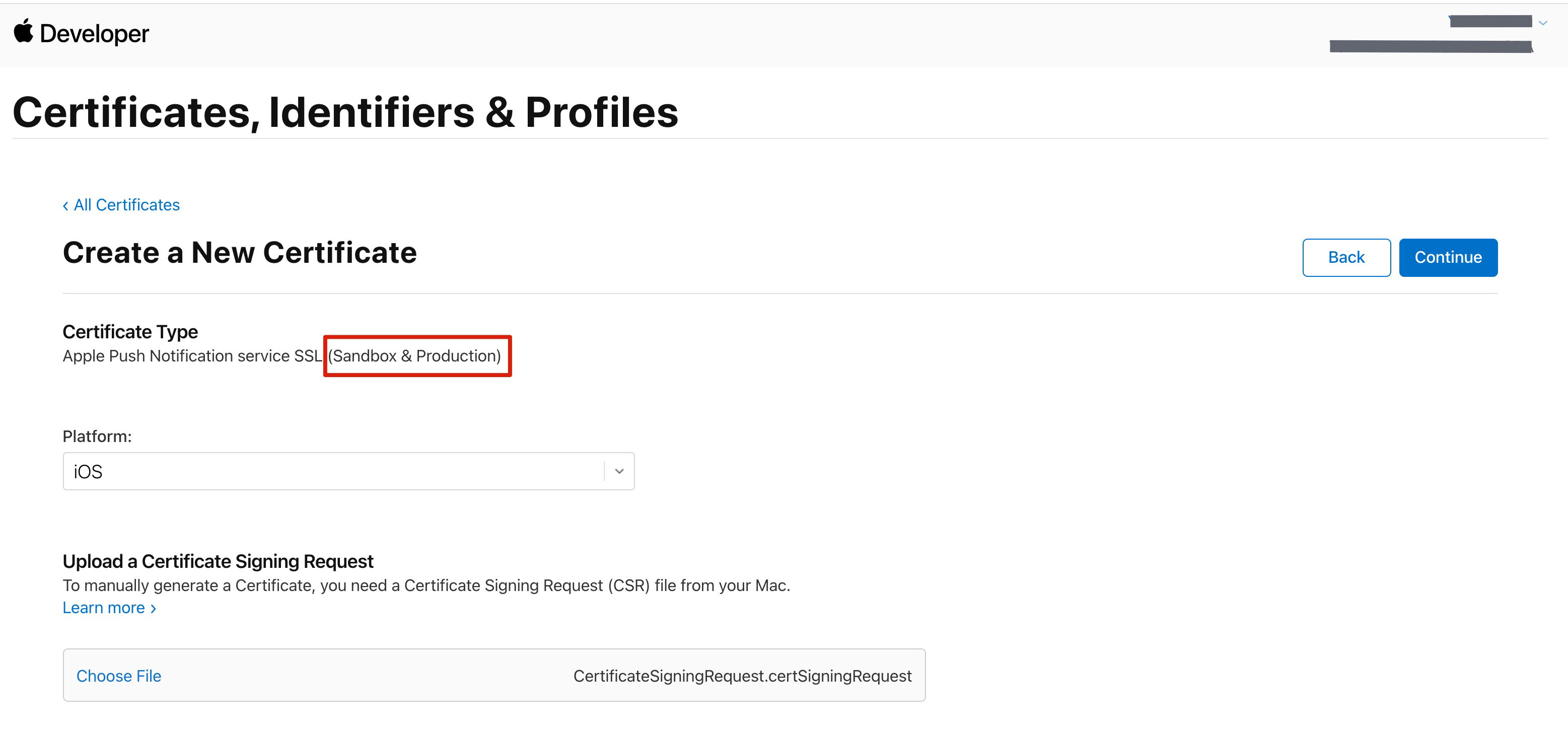 3. Choose Create Certificate for the Development environment. The system will prompt you to provide a Certificate Signing Request (CSR).