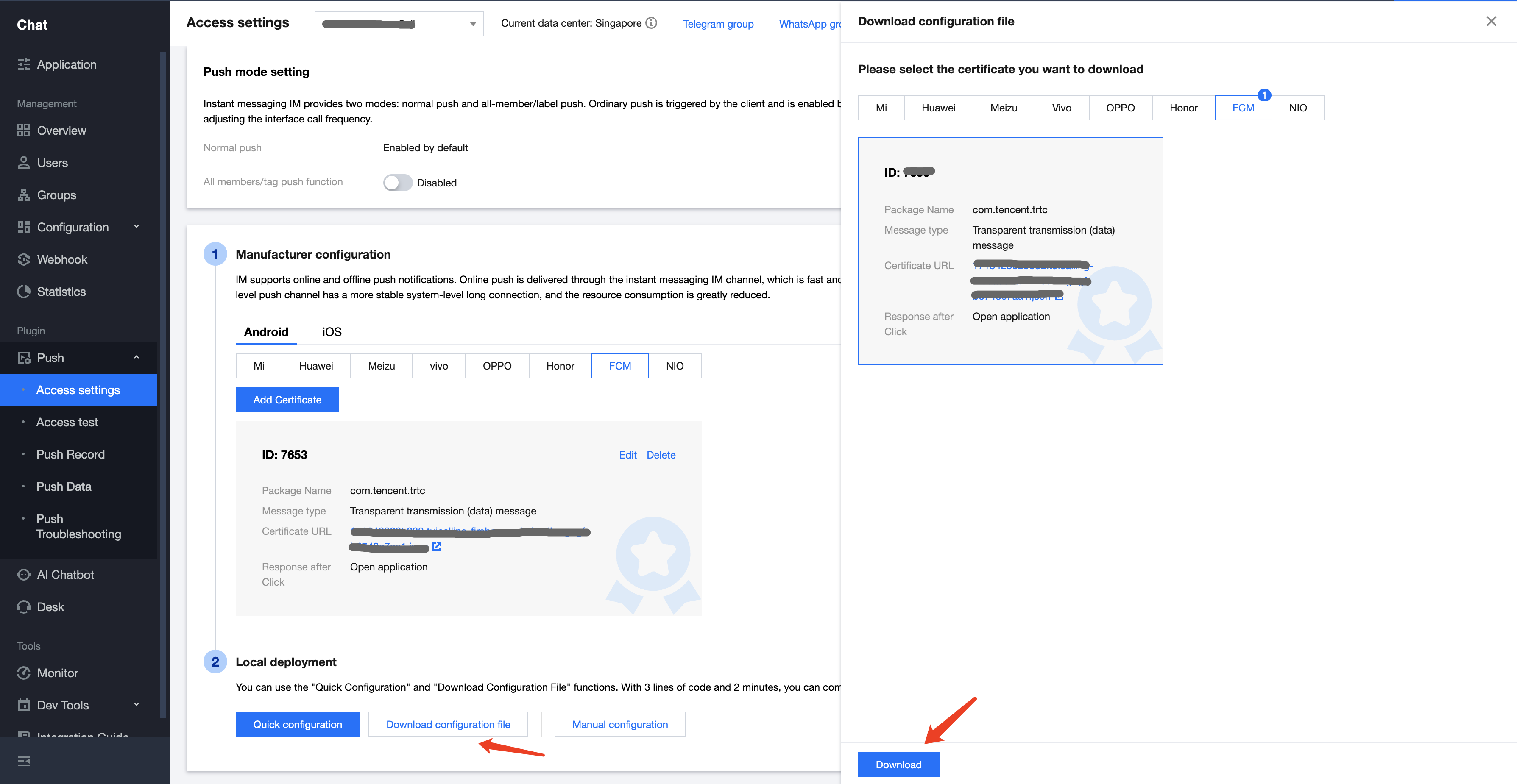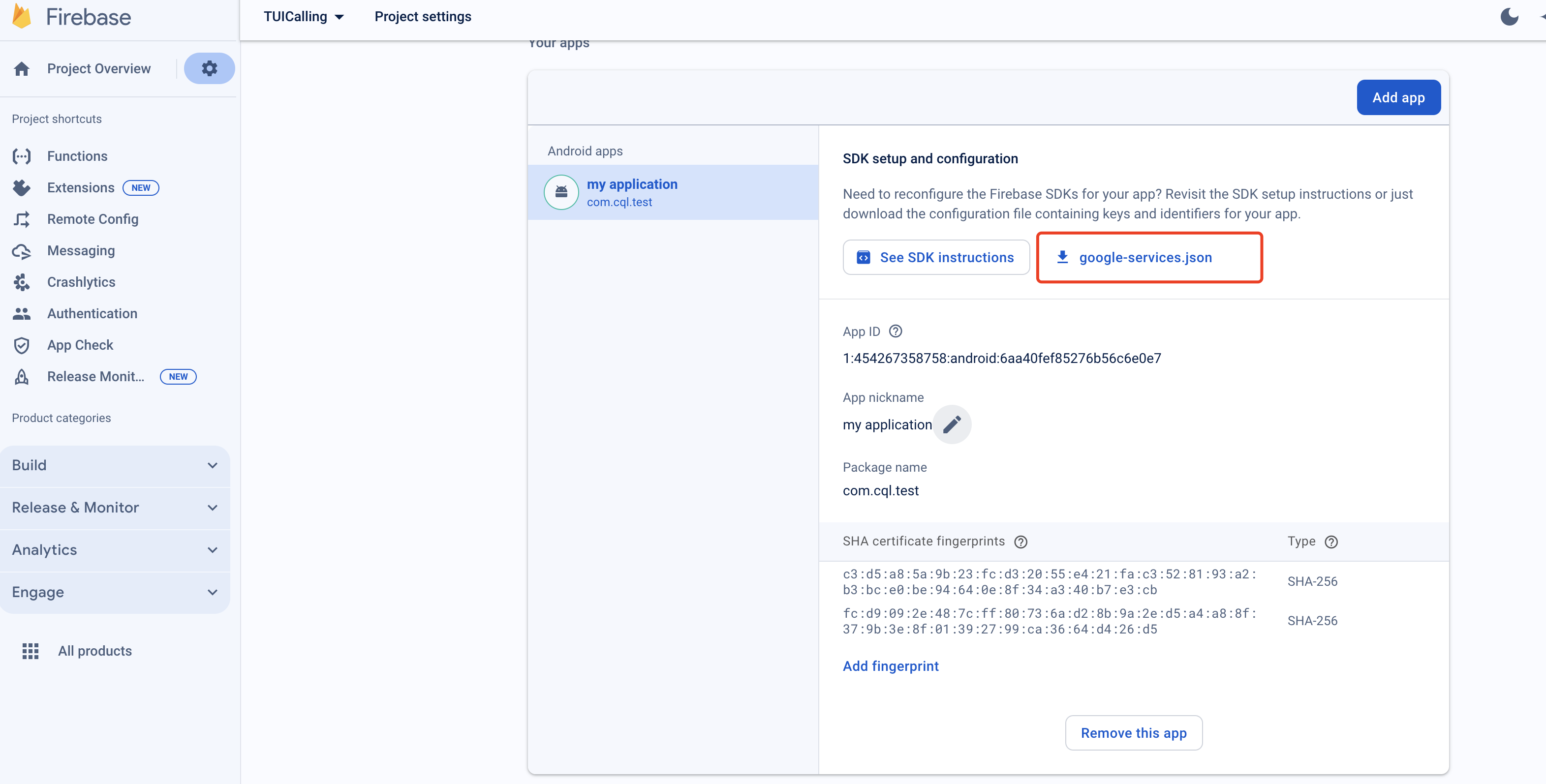 1. Register your app on the FCM Push Platform to obtain your AppID, AppKey, and the google-services.json file required for offline push functionality. Download and Add Configuration Files