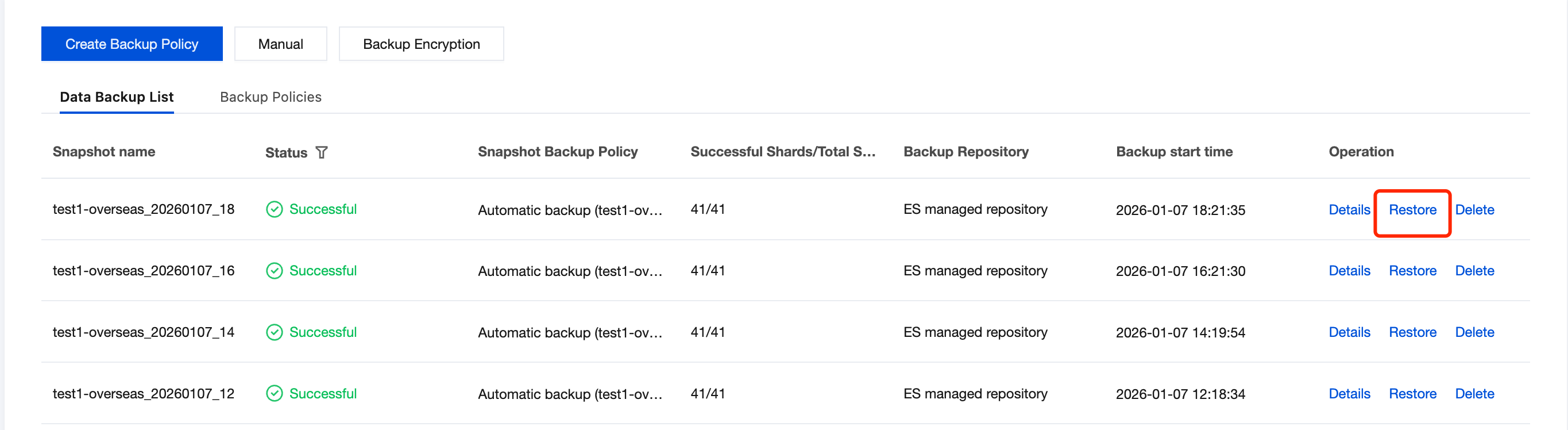 Locate the snapshot to be deleted in the backup data list, click the Delete button in the action bar to delete the corresponding snapshot.
