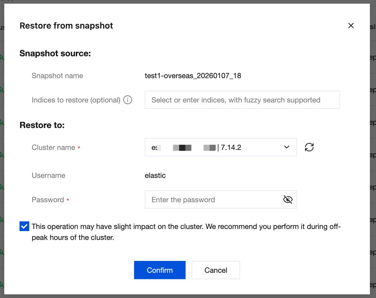 Log in to the Elasticsearch Service console, click the cluster ID/Name in the cluster list to enter the cluster details page. On the "Backup Management" page, locate the snapshot used for recovery in the backup data list, click the Restore button in the action bar, select the indexes to restore and the target cluster, enter the target cluster's user password, and restore the selected backup to the target cluster. The indexes to restore are optional. Without specifying indexes, full restoration of all indexes is performed.