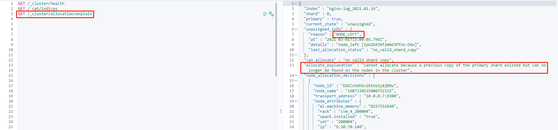 current_state). This problem occurs because the node to which the shard was assigned left the cluster (unassigned_info.reason).can_allocate).allocate_explanation).unassigned_info.reason)allocation explain API.Reason | Description |