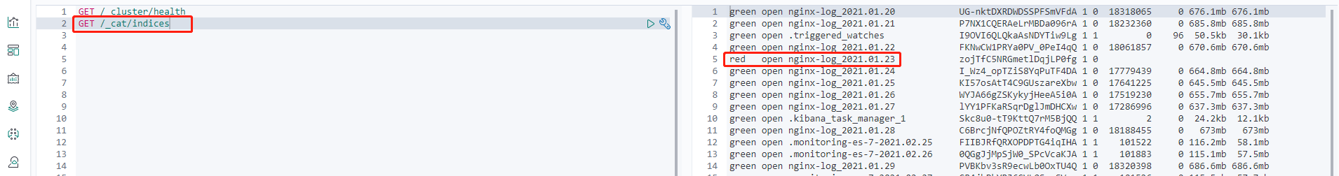 status | Health status of the cluster, based on the state of its primary and replica shards. Statuses are: green: all shards are assigned yellow: all primary shards are assigned, but one or more replica shards are unassigned. If a node in the cluster fails, some data may be unavailable until that node is repaired red: one or more primary shards are unassigned, so some data is unavailable. This can occur briefly during cluster startup as primary shards are assigned |