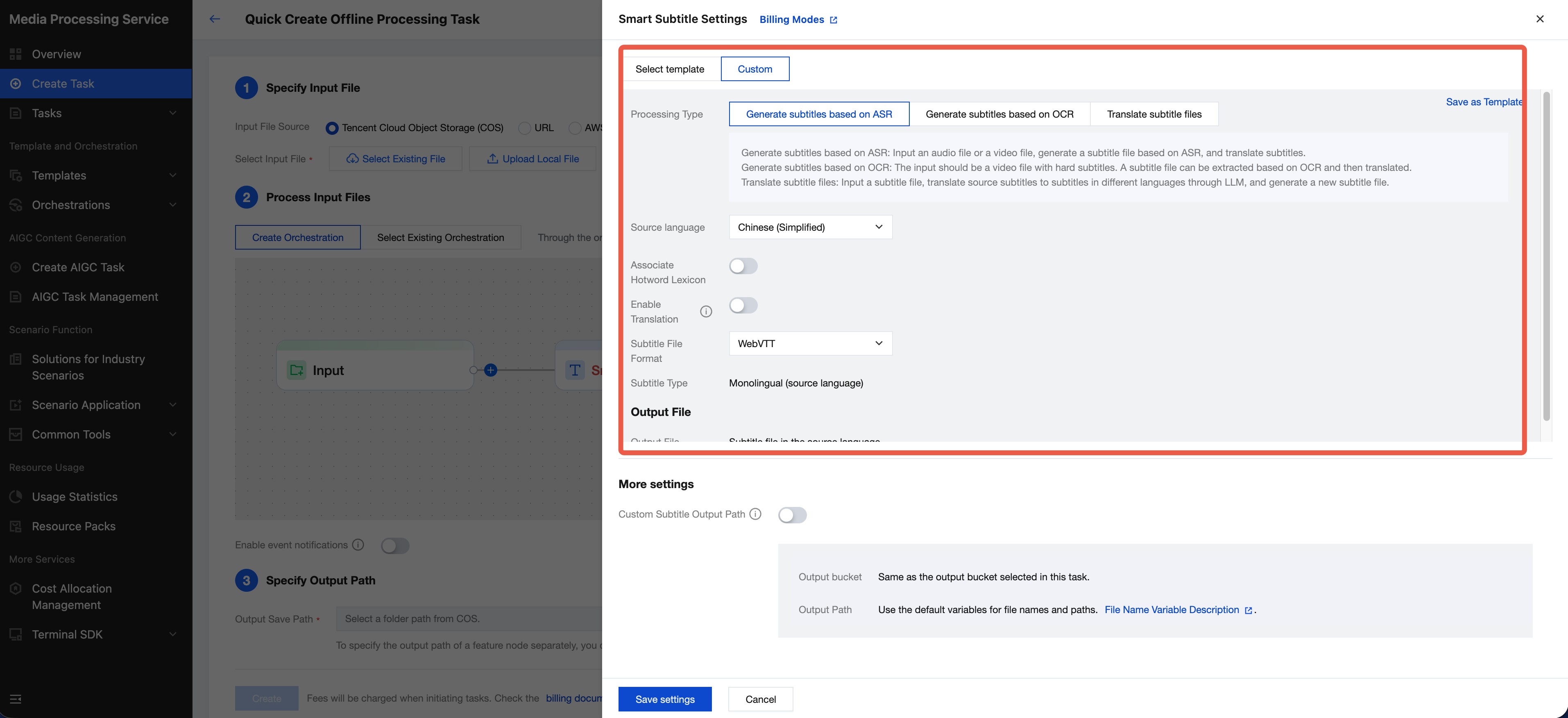 {"InputInfo": {"Type": "URL","UrlInputInfo": {"Url": "https://test-1234567.cos.ap-guangzhou.myqcloud.com/video/test.mp4" // Replace it with the video URL to be processed.}},"SmartSubtitlesTask": {"Definition": 122, //122 is the ID of the preset Chinese source video—generate Chinese and English subtitles template, which can be replaced with the ID of a custom smart subtitle template."UserExtPara": "" //Extended parameter.},"OutputStorage": {"CosOutputStorage": {"Bucket": "test-1234567","Region": "ap-guangzhou"},"Type": "COS"},"OutputDir": "/output/","Action": "ProcessMedia","Version": "2019-06-12"}