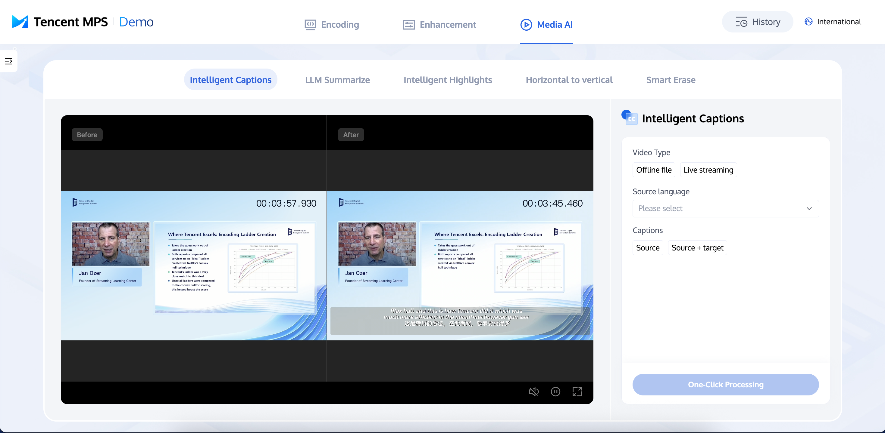 1. Access the Experience Center to navigate to the Intelligent Captions experience page. On the right-hand side, select either an offline video file or a live stream, specify the source language and caption type, and then click One-Click Processing. 2. Once the processing is complete, you can view the results.