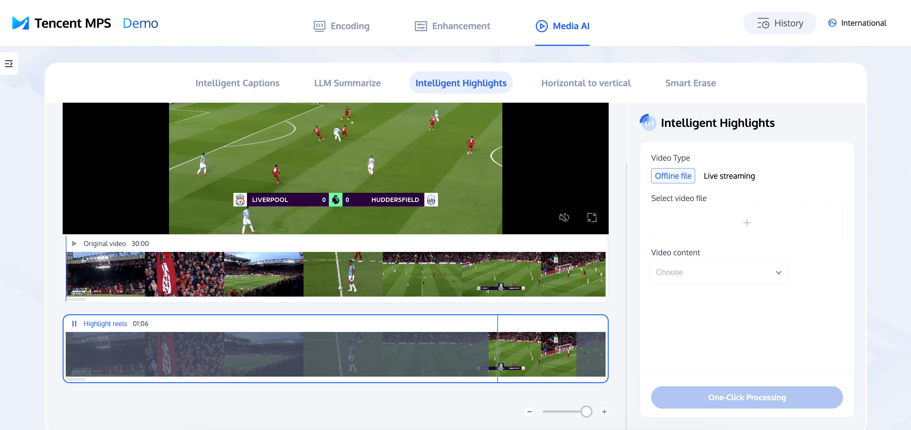 1. Access the Experience Center to navigate to the Intelligent Highlights page. On the right side, select either an offline video file or a live stream, specify the video content category, and click One-Click Processing. 2. Once the processing is complete, you can view the results.