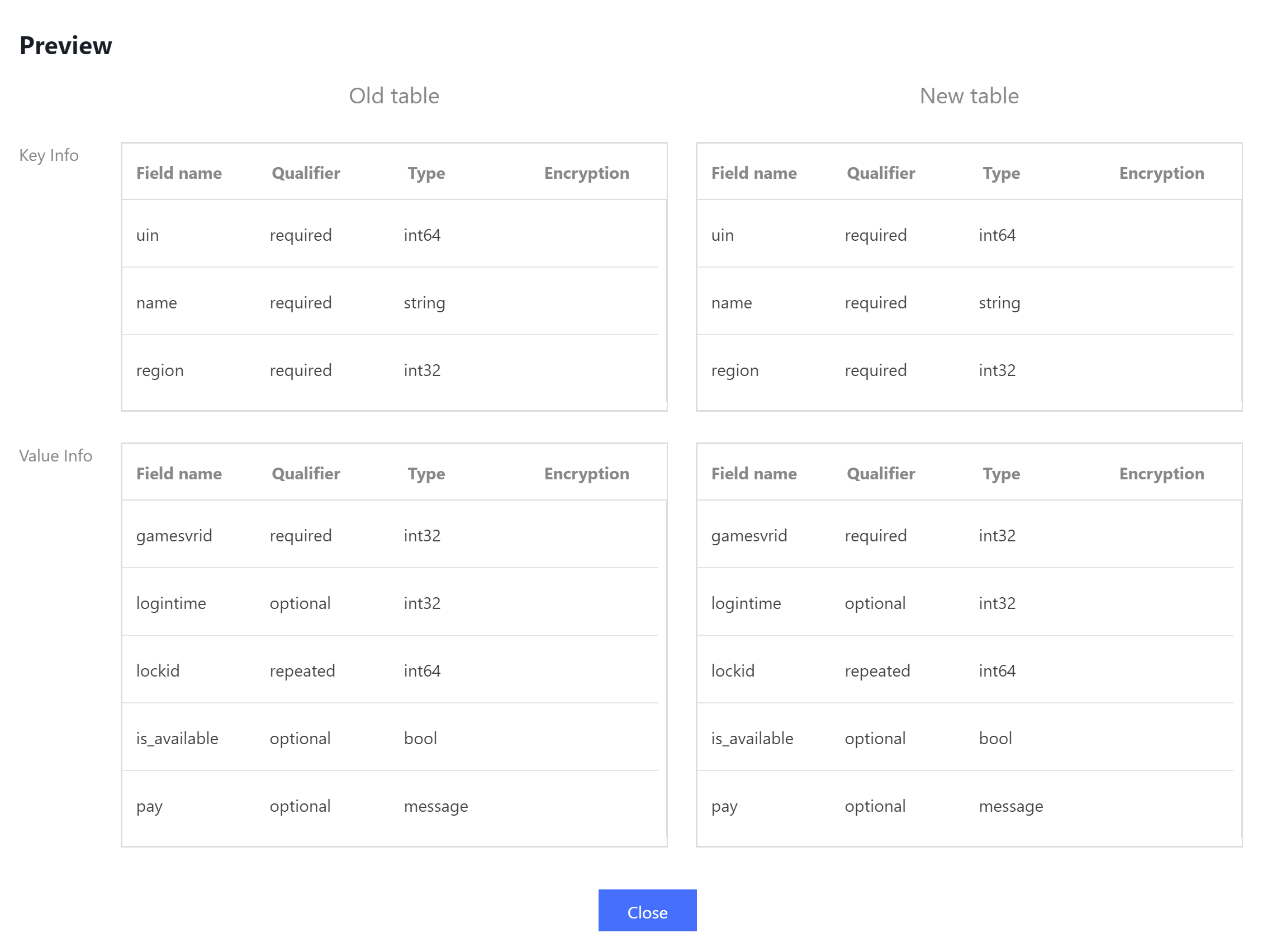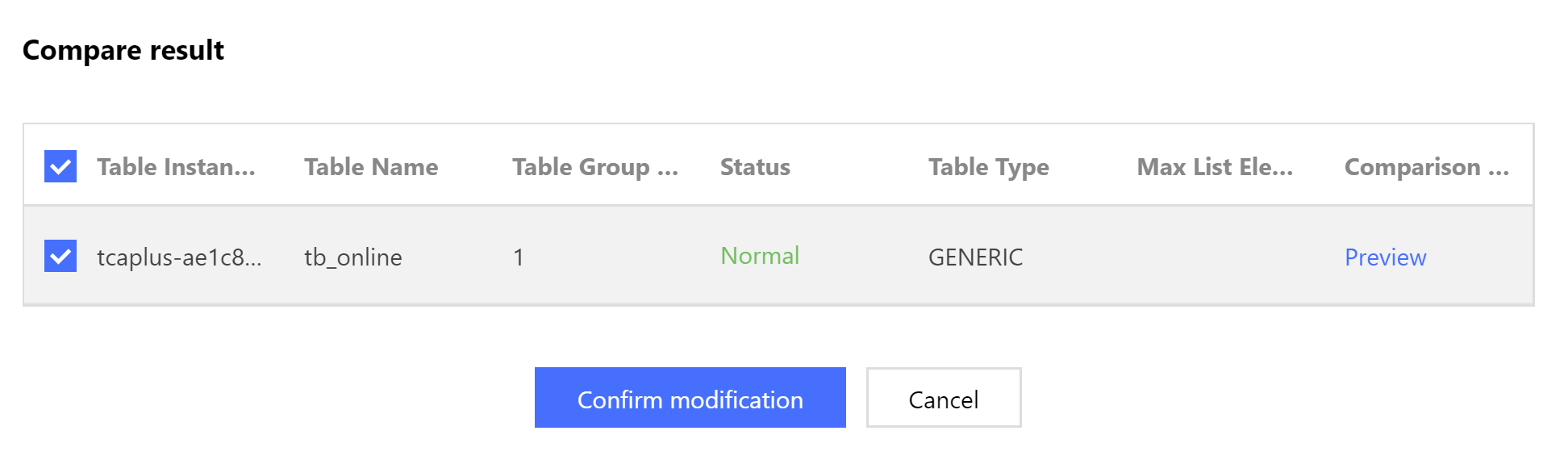 3. Di kotak dialog pop-up, Anda dapat melihat hasil perbandingan. Jika definisi tabel baru Anda tidak memenuhi aturan modifikasi tabel TcaplusDB, perintah akan ditampilkan.