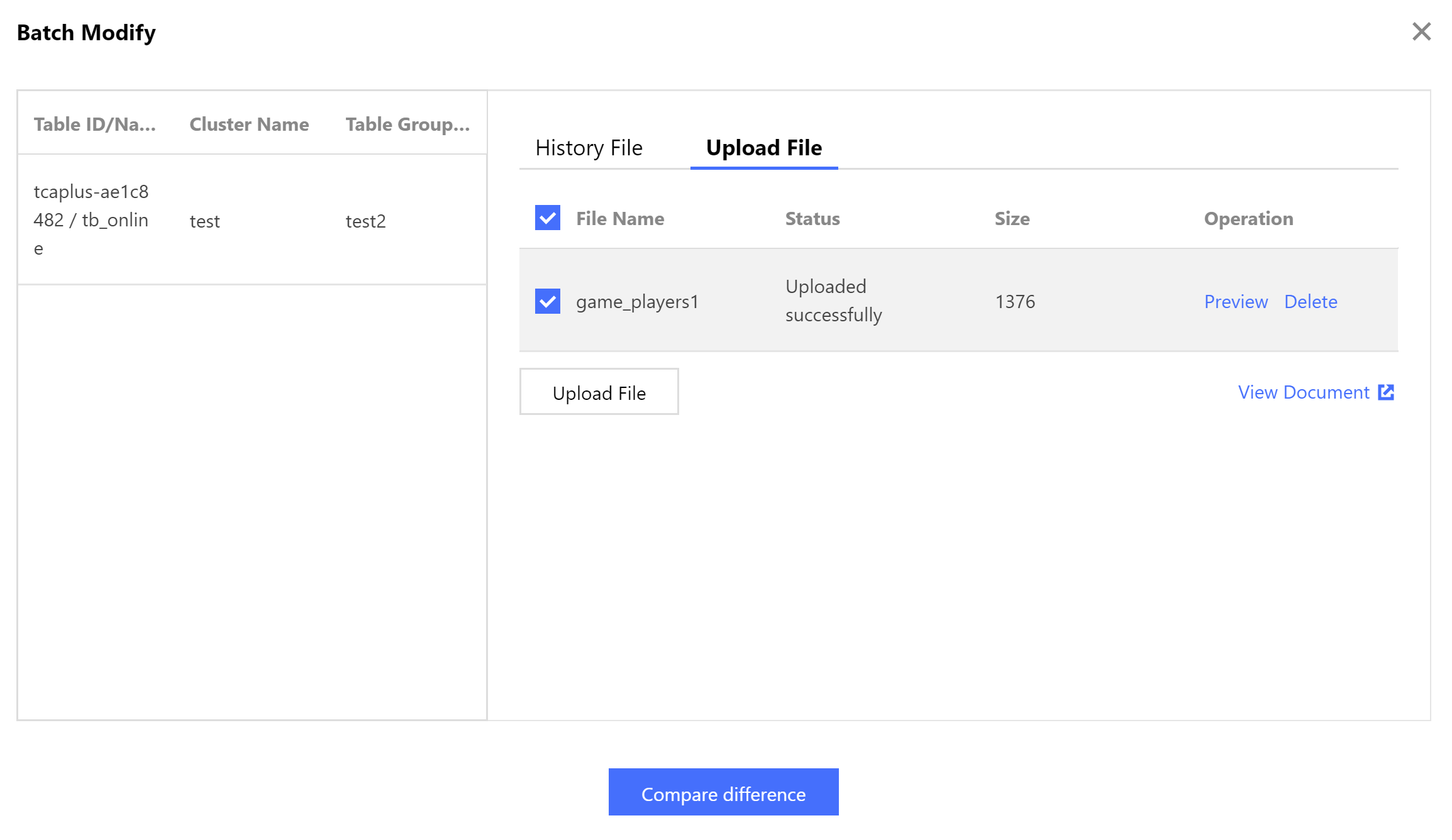 1. Masuk ke halaman Daftar Tabel dan pilih tabel target. Pilih More (Lainnya) > Modify (Modifikasi) di kolom "Operation" (Operasi) atau pilih beberapa tabel dan klik Batch Modify (Modifikasi Massal) di bagian atas. 2. Di kotak dialog "Modify" (Modifikasi) yang muncul, unggah atau pilih file definisi tabel baru dan klik Compare Difference (Bandingkan Perbedaan).