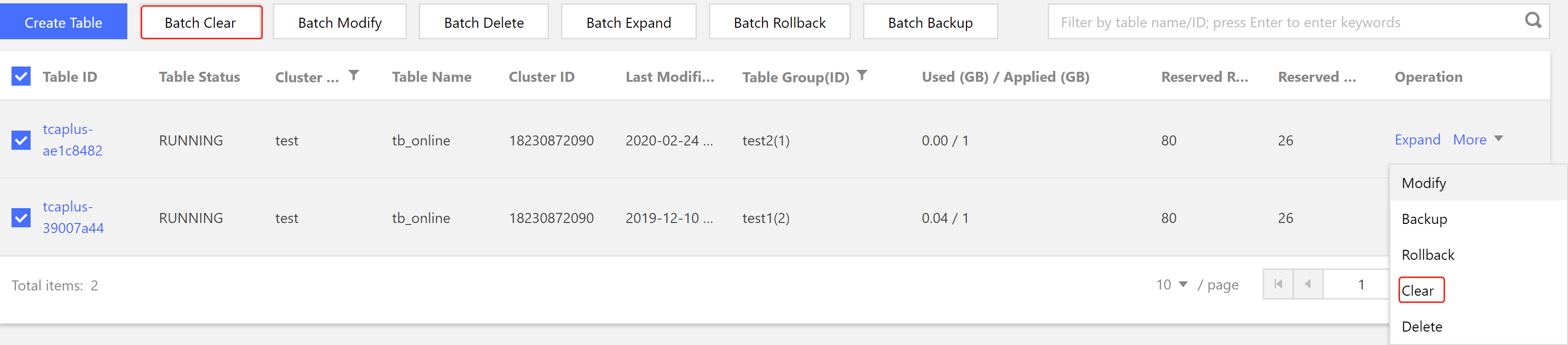 1. Masuk ke halaman Daftar Tabel, pilih tabel target dan klik More (Lainnya) > Clear (Hapus) di kolom "Operation" (Operasi), atau pilih beberapa tabel dan klik Batch Clear (Hapus Massal) di atas.
