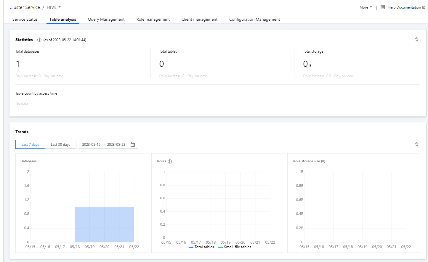 1. Log in to the EMR console and click the ID/Name of the corresponding cluster in the cluster list. 2. On the cluster details page, click Cluster Service and choose Operation > Table Analysis in the top-right corner of the Hive component block to view table and data information based on Hive MetaStore as of the last collection time.
