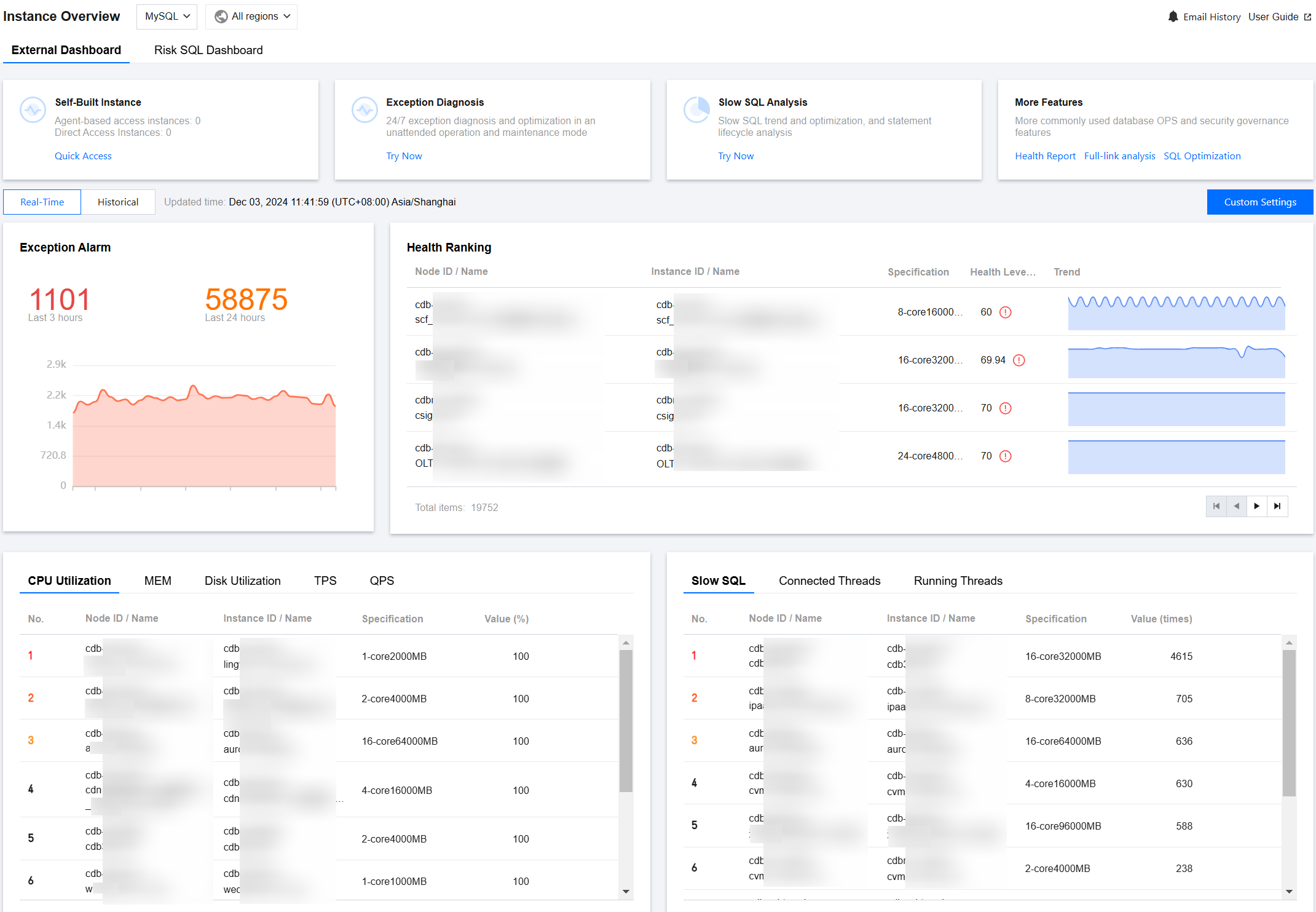 Top Performance Monitoring Metrics | Displays the top-ranking performance monitoring metrics by consumption in the Resource Monitoring Ranking. MySQL database metrics include: CPU, memory, disk utilization, TPS, QPS, slow SQL, Connected Threads, and Running Threads. TDSQL-C for MySQL database metrics include: CPU, memory, commit count, operations per second, slow SQL, Connected Threads, and Running Threads. TencentDB for MariaDB and TDSQL for MySQL database metrics include: CPU, data disk utilization, slow SQL, Connected Threads, and Running Threads. Tencent Cloud Distributed Cache database metrics include: CPU utilization, memory utilization, connection utilization, inbound traffic utilization, outbound traffic utilization, and read request hit rate. TencentDB for MongoDB database metrics include: CPU, memory, disk, QPS, number of connections, requests (>100 ms), and average request latency. Click the row of the corresponding instance (or shard) to perform the following operations: Click Monitor to enter the corresponding Intelligent Monitoring > Full Instance Monitoring page corresponding to the instance (or shard) to view the monitoring data. Click Optimization to enter Performance Optimization > Exception Diagnosis page corresponding to the instance (or shard) to view details of the exception diagnosis. |