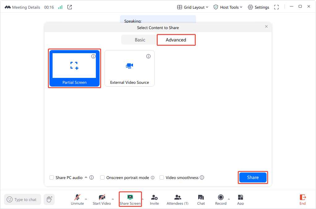2. Click Advanced, select Partial Screen and click Share to select the shared area.