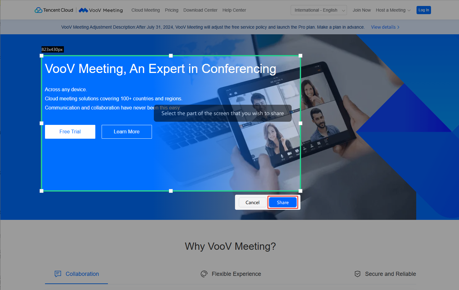 Before starting sharing, you can adjust the position and size of the area for sharing, which cannot be adjusted after sharing starts. If you want to adjust the area position or size during sharing, you can select New Share to select an area again.
