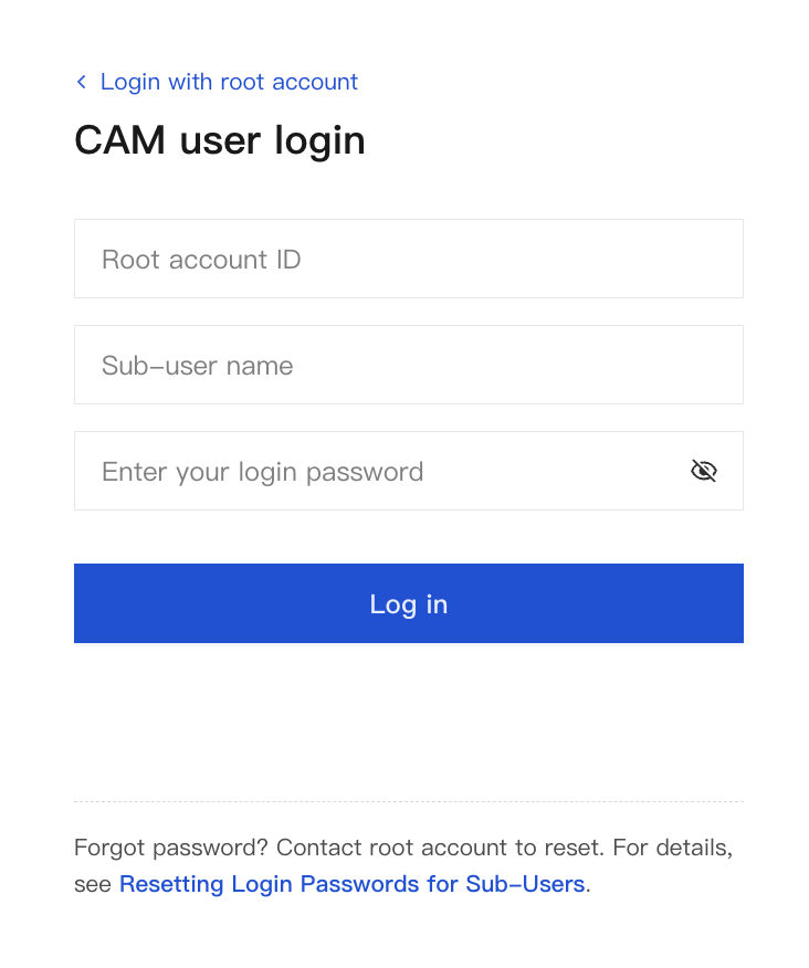 Enter the partner’s root account ID. When you copy and open the login URL provided by the reseller, the root account ID will be automatically filled in on the login page. |