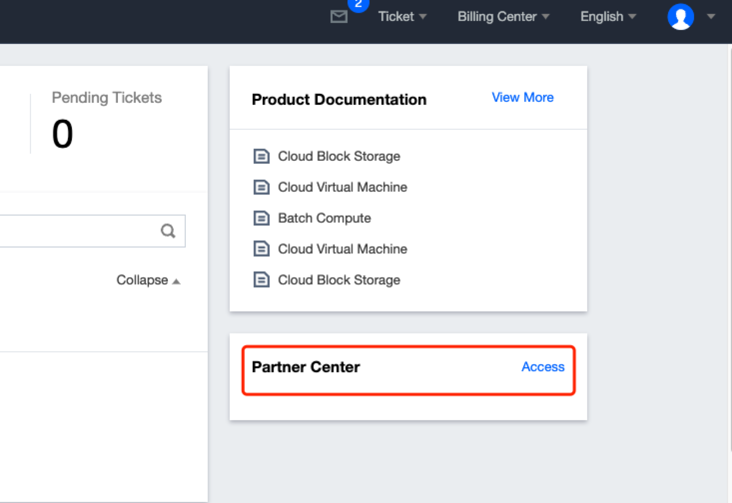 If you are a second-level reseller, click Access under Partner Center to enter the Partner Center console.