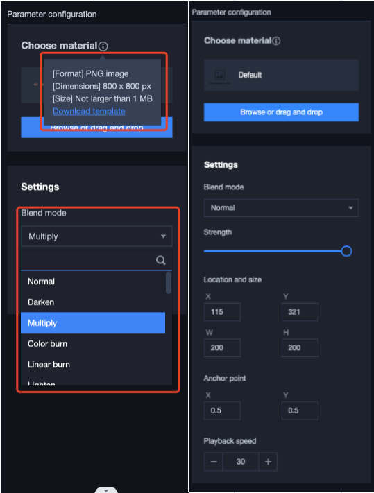 2. After you add an effect, you will find the details of the effect in the Parameter configuration area. You can change the parameters of the effect here, such as the blend mode (the same as those in Photoshop) and strength (transparency). For a sticker effect, you can also adjust its location, size, and playback speed (fps).