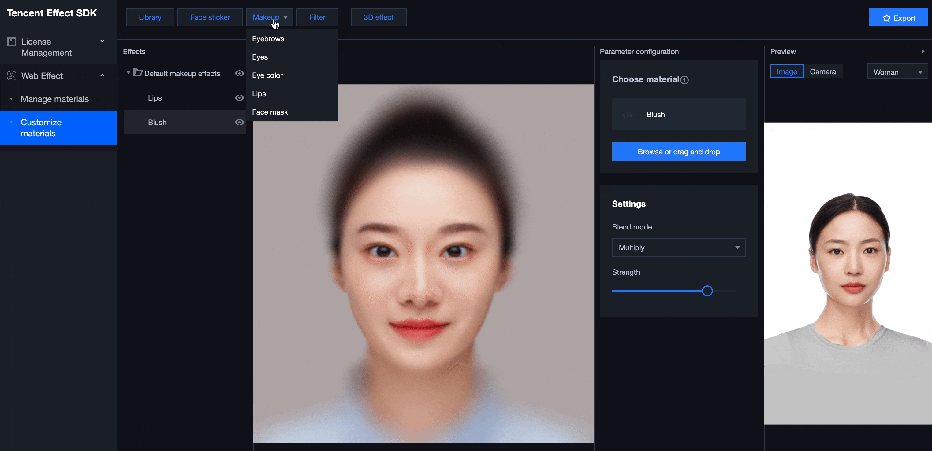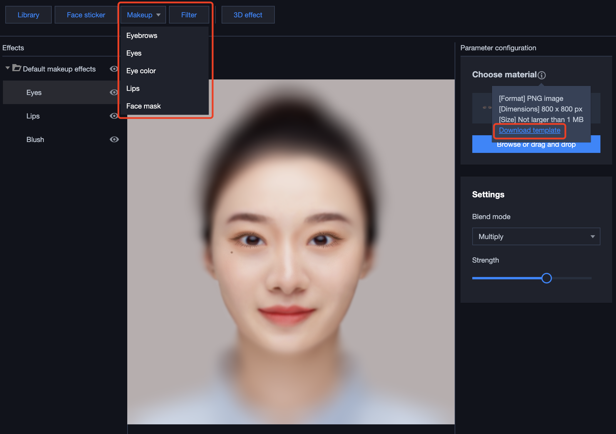 Click Makeup at the top, select an effect type, and upload your material in the Parameter configuration area.