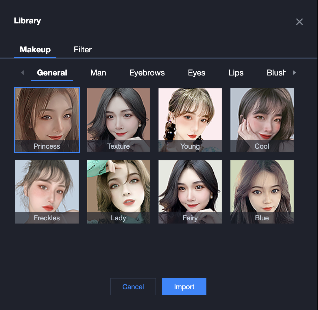 We offer a library of common filters and makeup effects which you can use directly in your material.