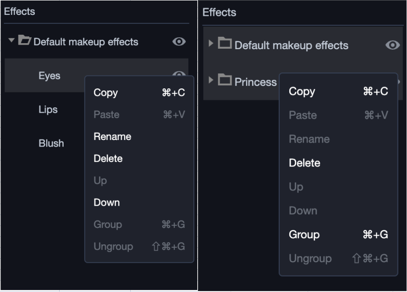 For example, if you want to replace the default eye makeup effect, select Eyes in the effect list, and upload your material.