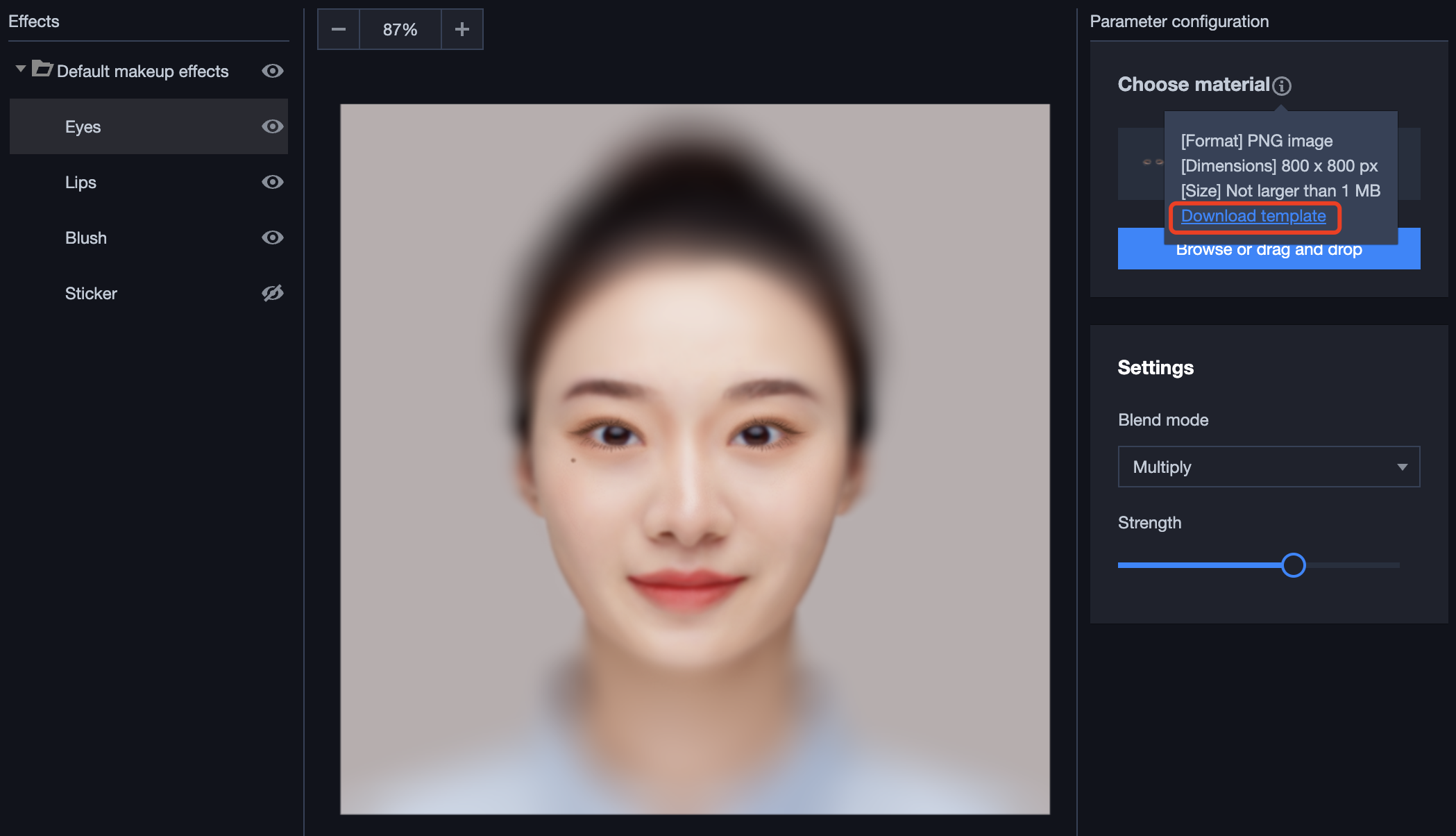 2. Click Makeup > Eyebrows/Eyes at the top and, in the Parameter configuration area, click Download template.