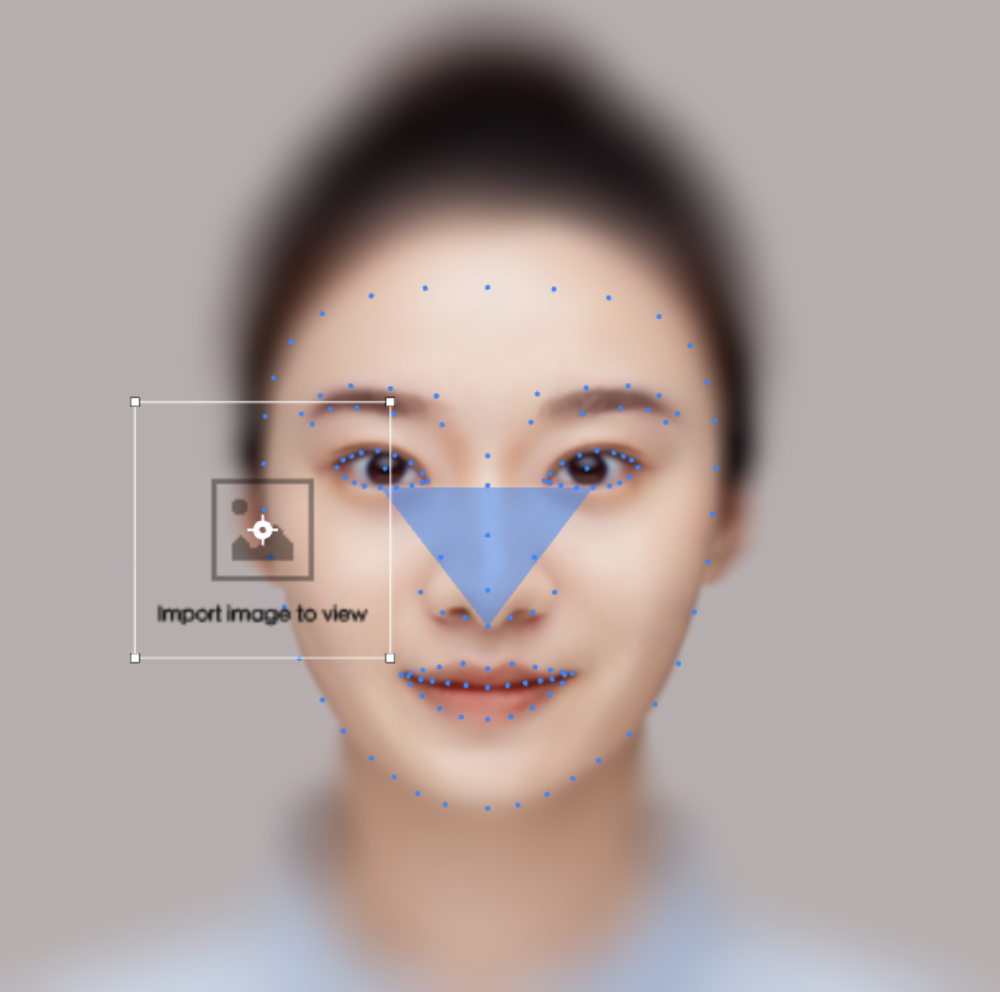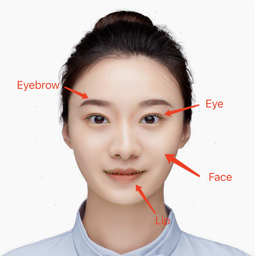 In addition to the human face model, we offer different PSD templates for different effect types (eye color, filters). To download the templates, just select the makeup effect you want to use at the top and then click Download template in the Parameter configuration area. For example, after you open the PSD template with Photoshop, you can design effects for the following points of the face. The template offers different reference points. To ensure that your effect applies well to the face, you should align your material closely to the reference points.