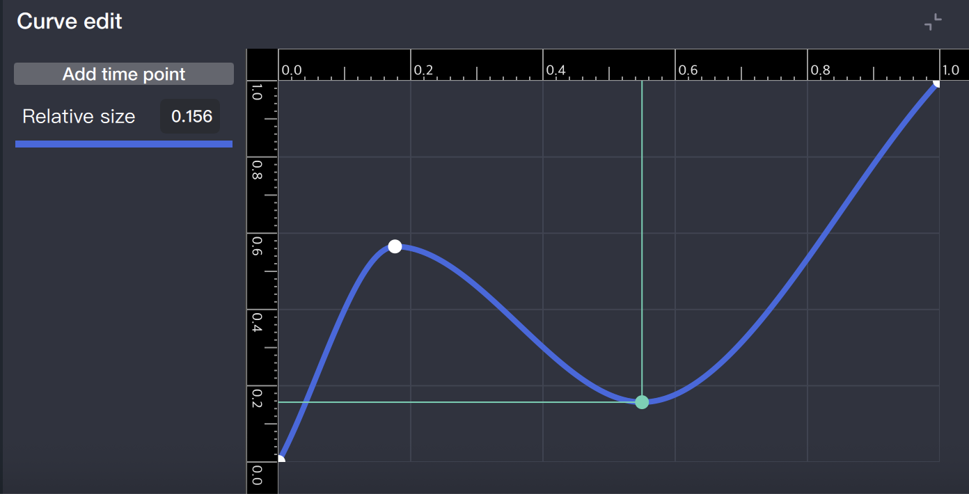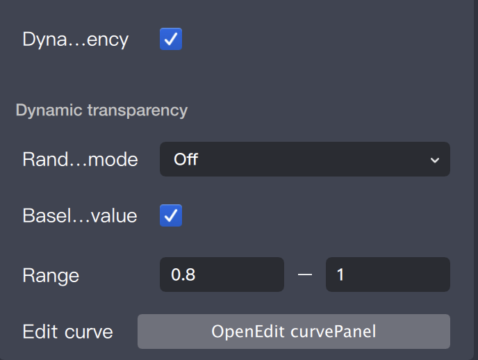 The curve coordinate system is normalized: the horizontal axis represents time, and the vertical axis represents the value. The actual size or opacity at any given time is calculated as Base Value × vertical axis value at that time, combined with random mode as configured.