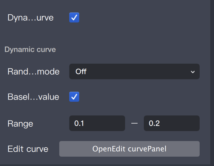 Base Value represents the value corresponding to 1.0 on the curve. When "Enable Random Base Value" is enabled, each particle's base value is randomly chosen within the specified range.