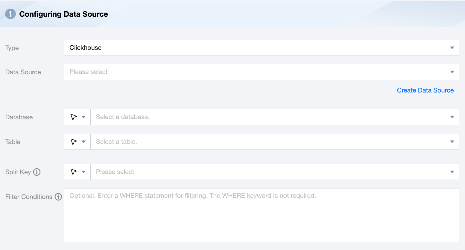 Split Key | When extracting data from ClickHouse, if splitPk is specified, it indicates that you want to use the field represented by splitPk for data sharding. As a result, data synchronization will start concurrent tasks, improving data synchronization efficiency. You can use a column from the source data table as a split key. It is recommended to use the primary key or an indexed column as the split key. Only integer fields are supported.