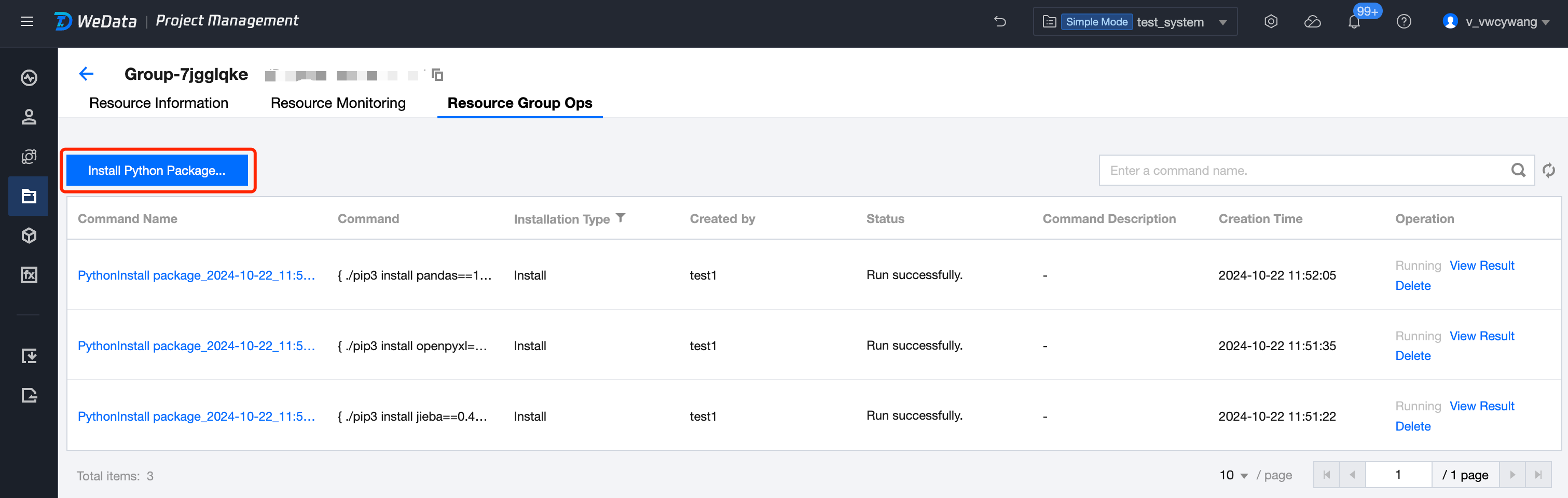 2. In the resource operation and maintenance interface, click Python Package Installation to install built-in Python libraries. It is recommended to install the Python 3 version.