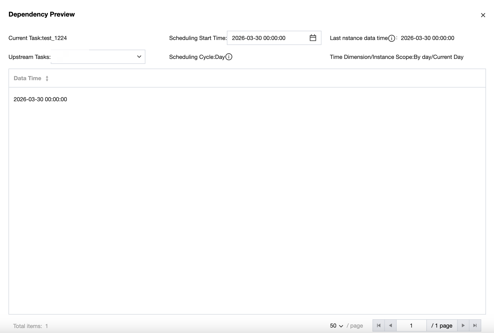 one-time | (1) By day/on the day: All minutely task instances within the specified date. | (1) By day/on the day: Default cross-cycle: depend on all hourly task instances on the day of the specified time. | (1) By day/on the day: depend on daily task instances within the specified date. | (1) By week/this week: one-time tasks within a week can only run after the weekly task is completed. | (1) By month/this month: one-time tasks within a month can only run after the monthly task is completed. | (1) By year/this year: one-time tasks within a year can only run after the annual task is completed. | Depend on one-time task instances, irrespective of data time. | |