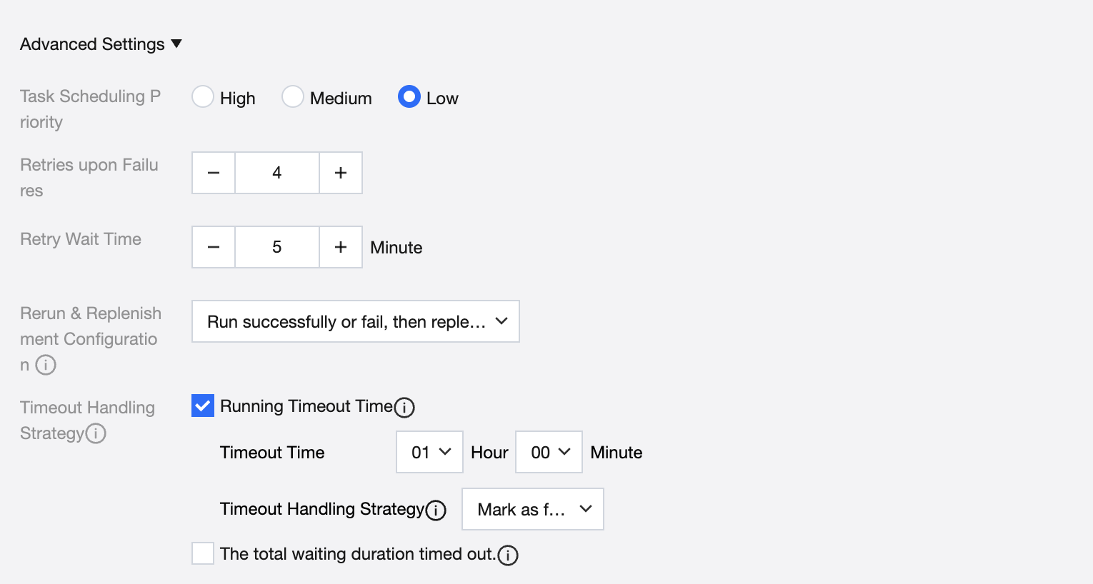 Timeout handling strategy | The action to execute when the runtime duration or waiting duration exceeds the set time. Optional timeout types include: Runtime timeout: calculate from the start time of the task instance running, trigger the timeout handling strategy if exceed the time limit. Wait timeout: trigger the timeout handling strategy if the total duration of waiting for event, waiting for upstream, or waiting for running status (wait for scheduling resource/concurrency quota) exceeds the set duration. Select it, then configure timeout period and processing policy. Processing policy includes: Timeout to failed: mark the instance as failed. Timeout retry: rerun the instance based on the number of retry attempts on failure and retry wait time at the top. |