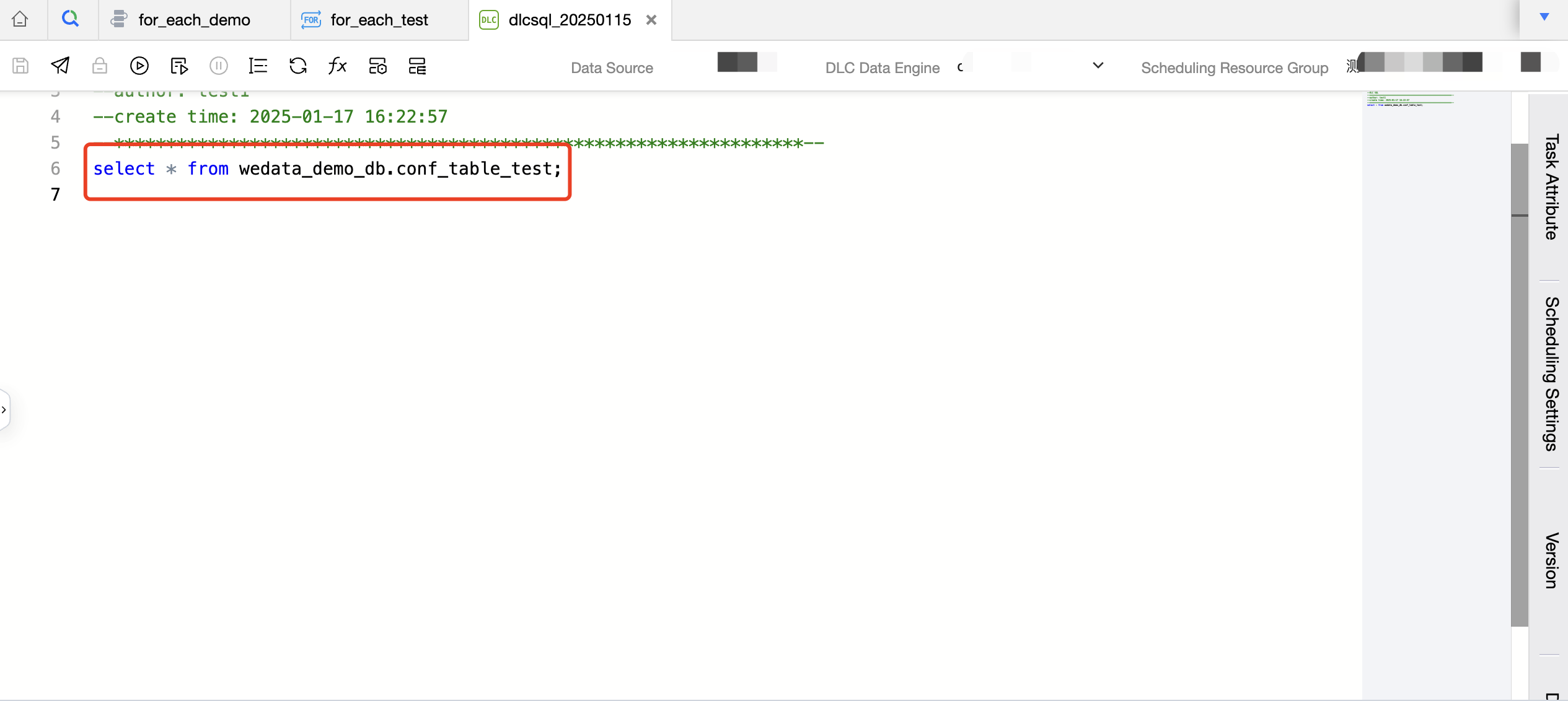1. Store the data integration source database information, source table information, destination database information, and destination table information in a single DLC table wedata_demo_db.conf_table_test. Create a DLC SQL task and read the data in the table wedata_demo_db.conf_table_test in the DLC SQL task.