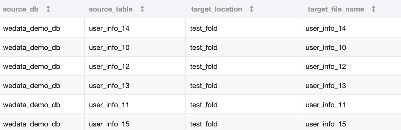 DataLakeCatalog.wedata_demo_db.user_info_10 | COS:/Bucket Name/dlc_write_form/test_fold/user_info_10.csv |