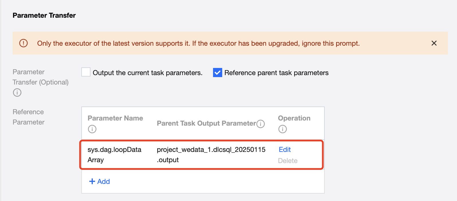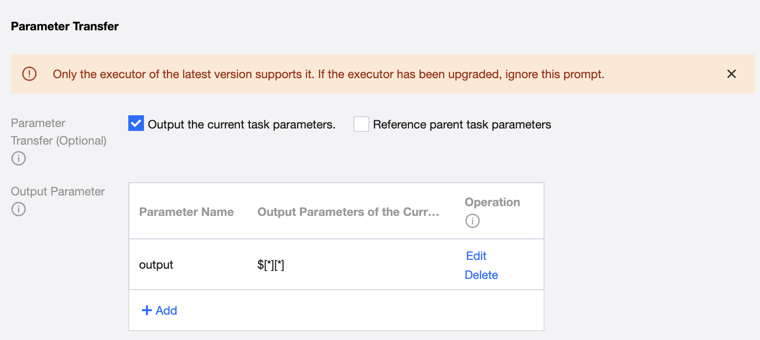 By default, parameter passing needs to obtain the passed parameters from the upstream, and the default parameter name is: sys.dag.loopDataArray. This parameter is used for loop traversal at runtime, and if it is not configured, the task cannot be submitted.
