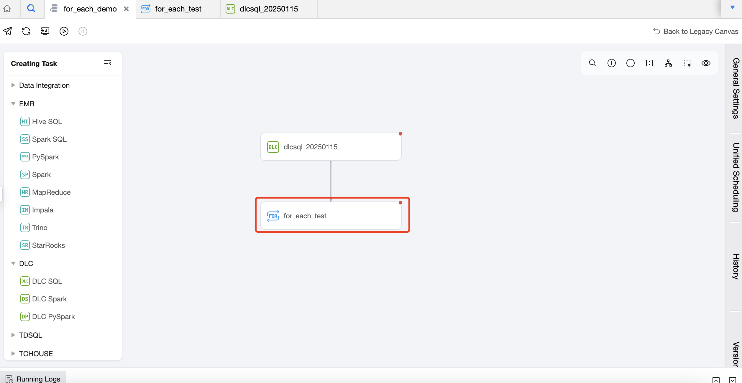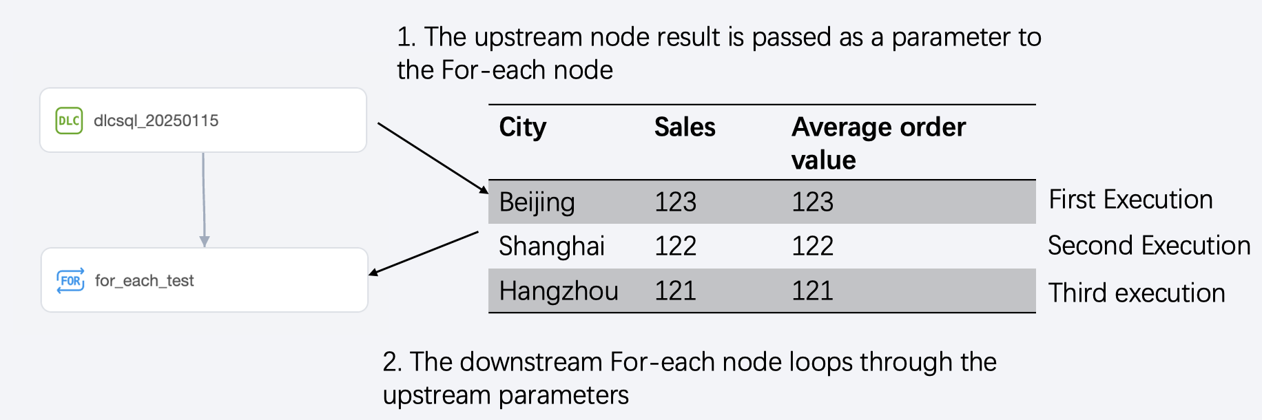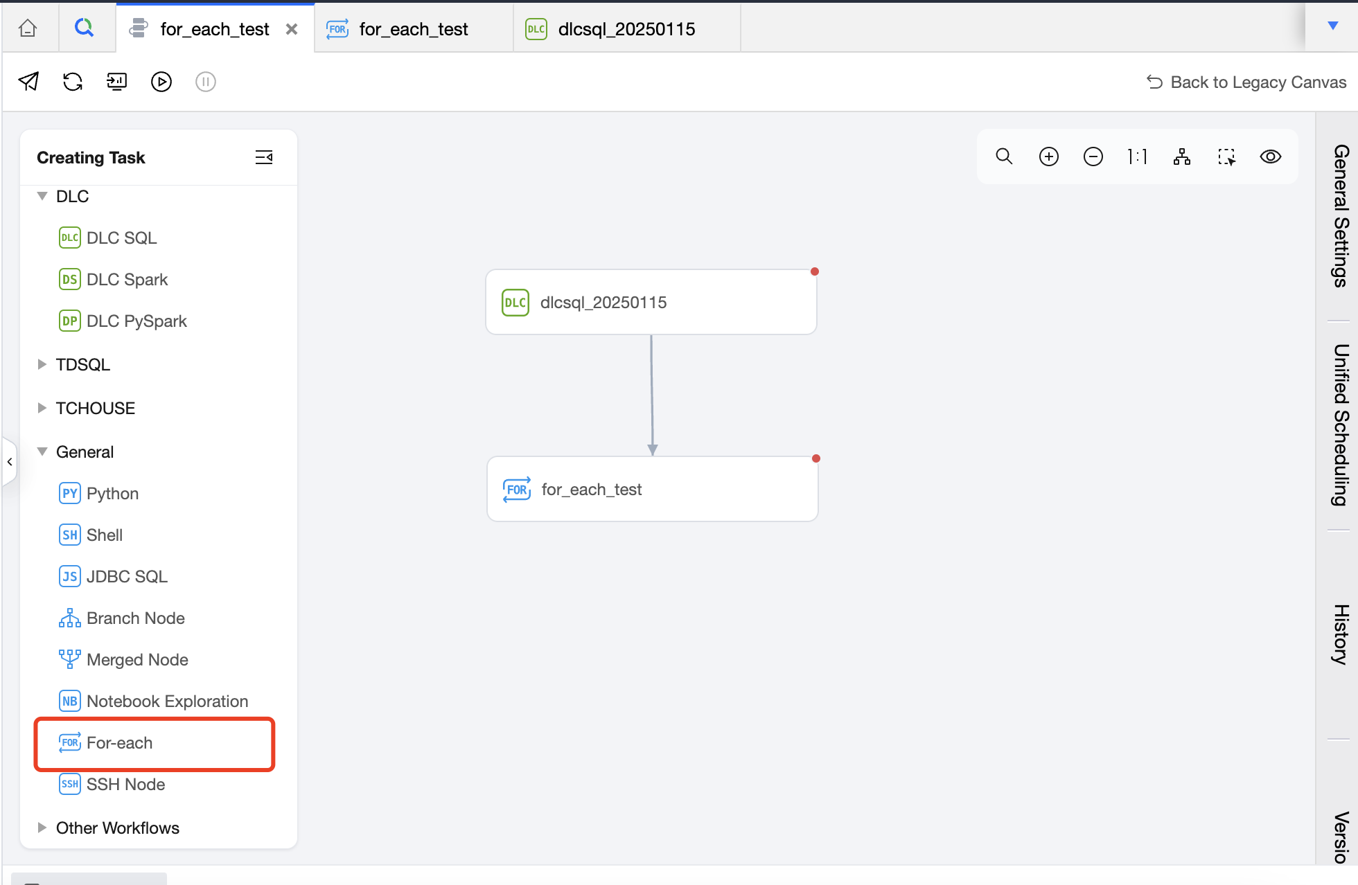1. Create a For-each node in the workflow and suggest an upstream and downstream relationship with the DLC SQL task.
