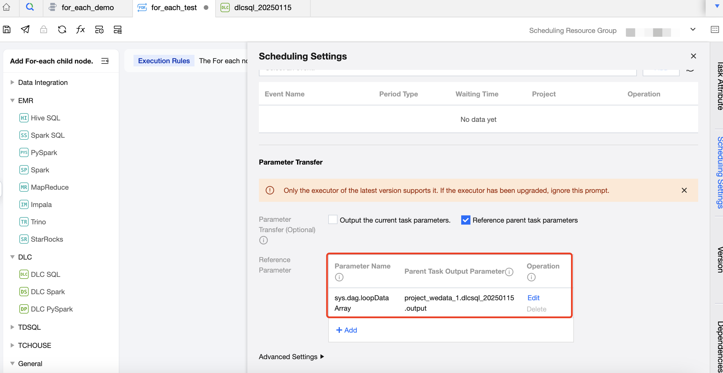 Configure the basic information and scheduling information of the For-each task, with a focus on referencing parent task parameters. Define parameters in the parameter passing module and configure parent task output parameters to read passed parameters from the upstream DLC-SQL.
