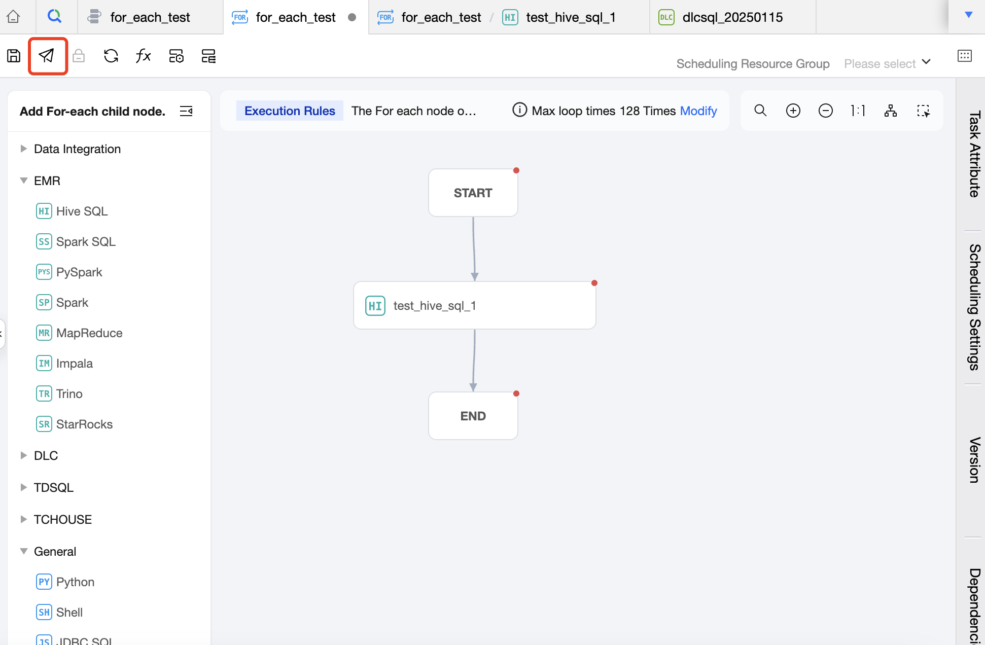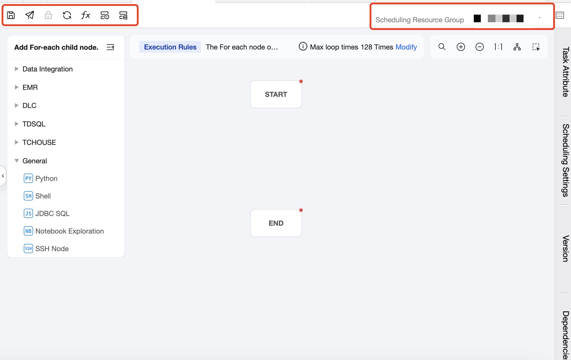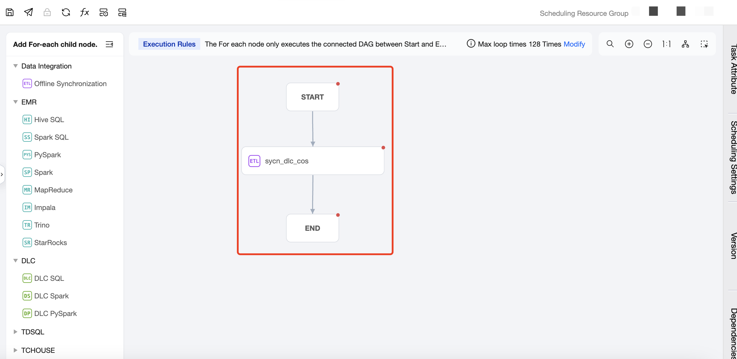 Task Type: Click on the task type on the left to add a sub-node. In the canvas area, you can orchestrate the sub-nodes and establish an upstream and downstream relationship. The For-each node will only run the DAG that is connected between START and END, and will not run the non-connected or forked part of the DAG. Therefore, nodes that you want to execute in a loop should be placed between the START node and the END node and connected with lines.
