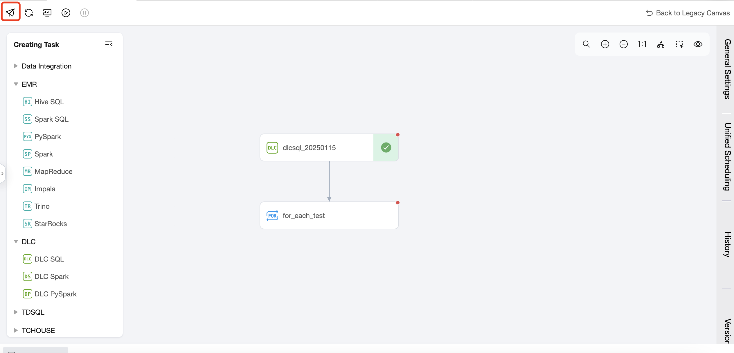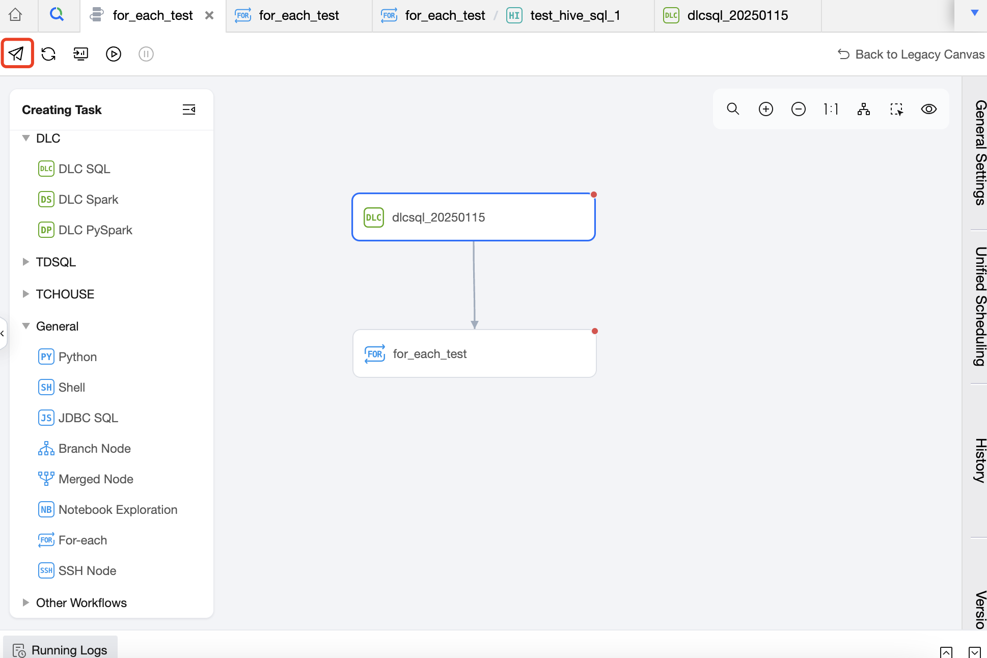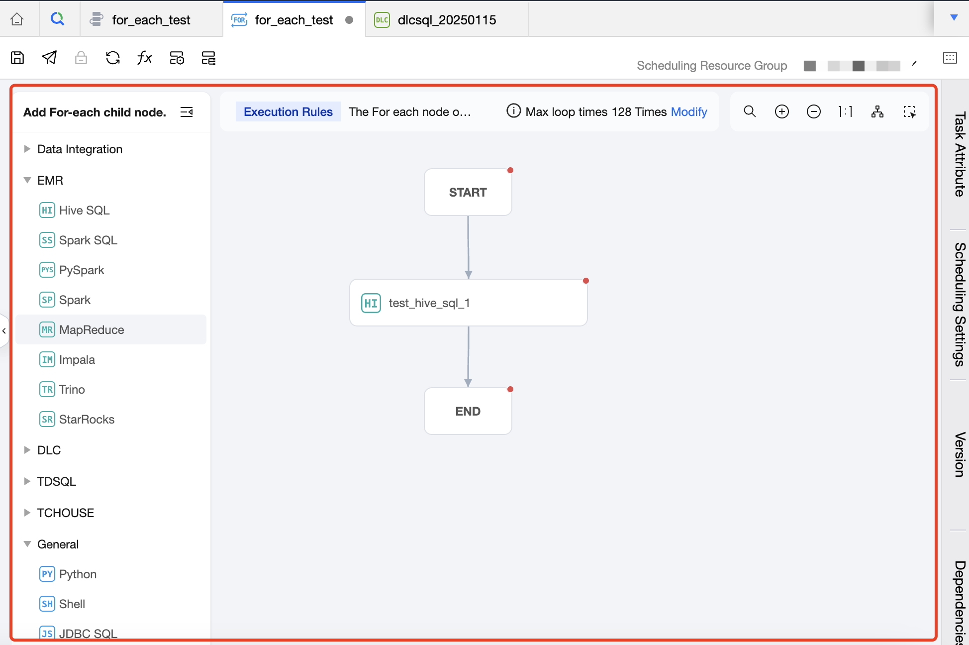 Task Type: Click on the task type on the left to add a sub-node. In the canvas area, you can orchestrate the sub-nodes and establish an upstream and downstream relationship. The For-each node will only run the DAG that is connected between START and END, and will not run the non-connected or forked part of the DAG. Therefore, nodes that you want to execute in a loop should be placed between the START node and the END node and connected with lines.