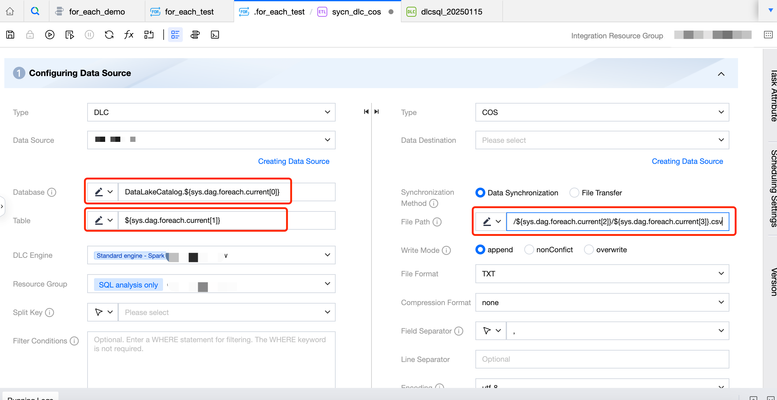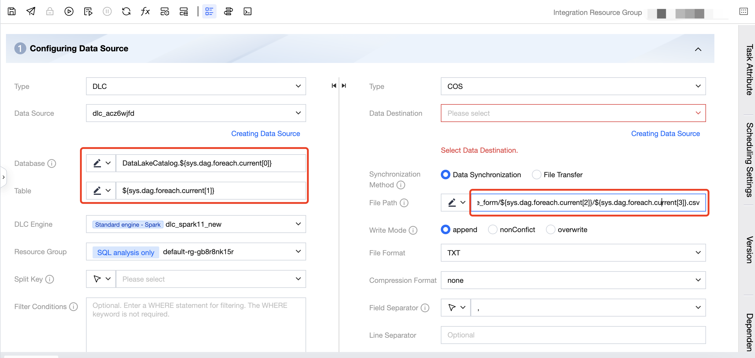 The COS path for the destination is configured as: COS:/Bucket Name/dlc_write_form/${sys.dag.foreach.current[2]}/${sys.dag.foreach.current[3]}.csv, indicating that the COS path changes dynamically with each iteration. Here, the data from the 2nd and 3rd columns of the current iteration's corresponding row are concatenated to obtain the final COS path.