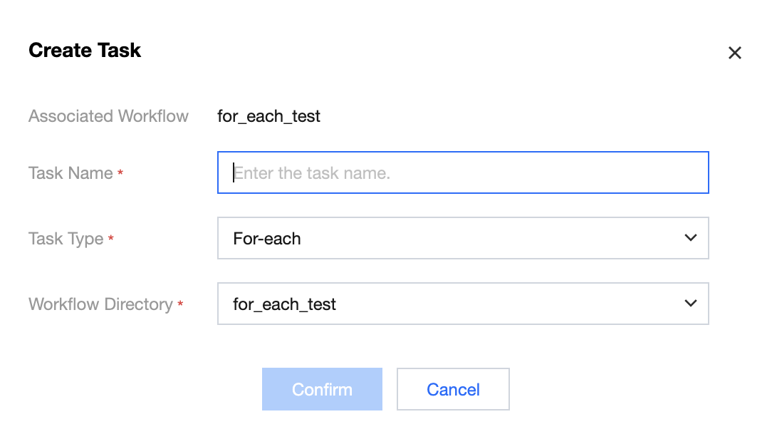 2. In the Create Task pop-up window, fill in the task name, associated workflow, and other information, and click confirm.