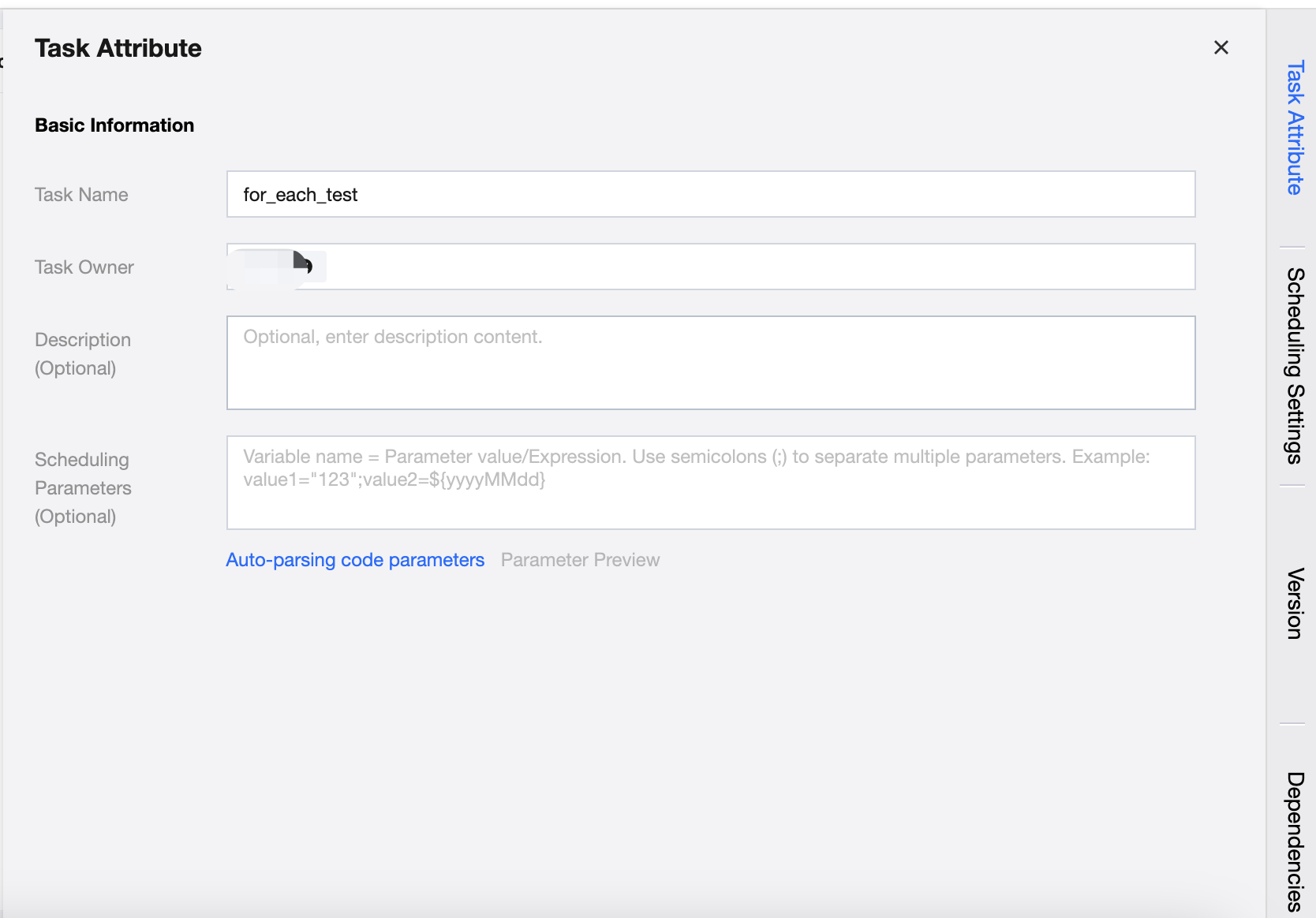 Configure the basic information of the task, including the task name, task owner, description, and scheduling parameters.