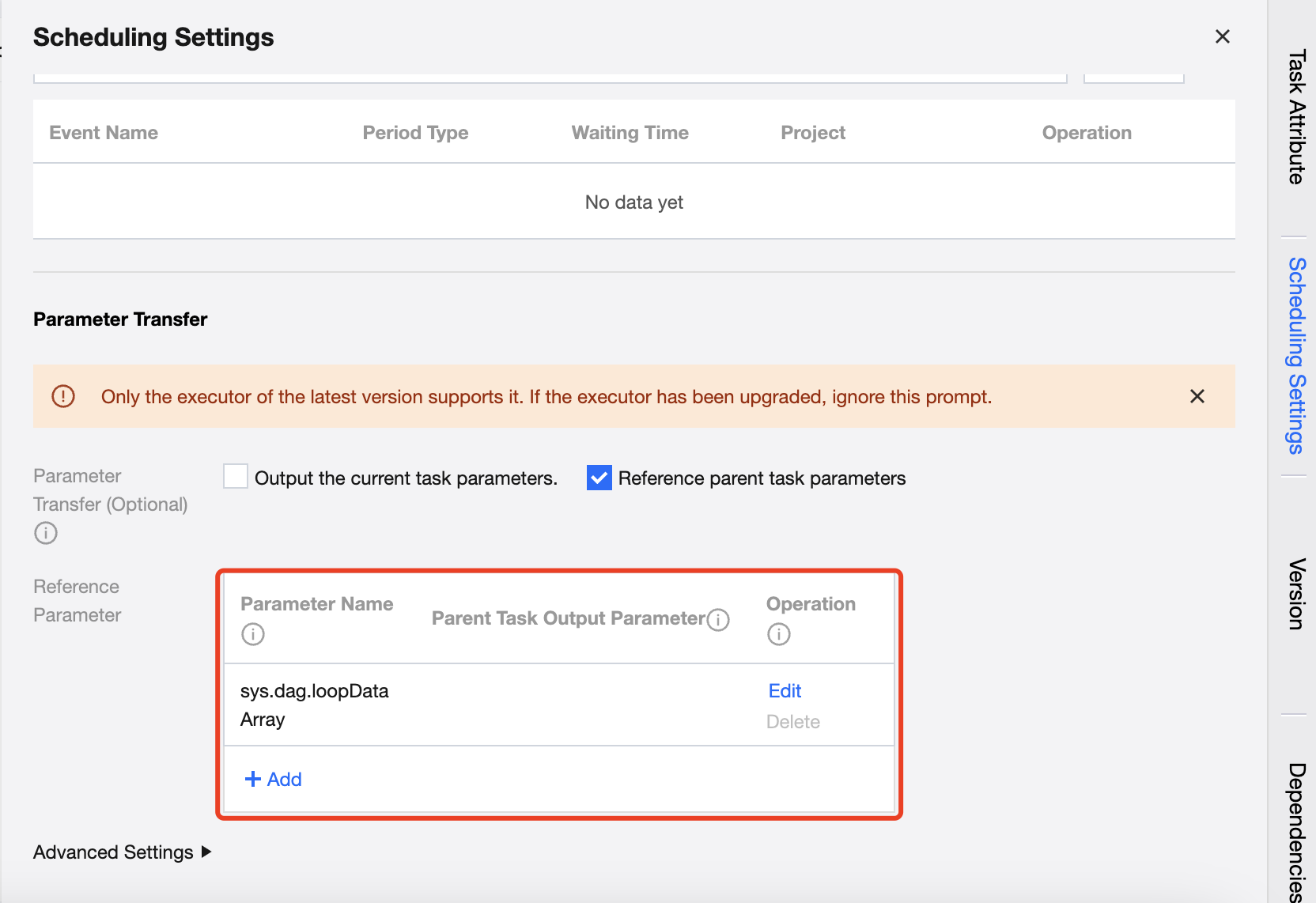 The scheduling settings for the For-each node are basically the same as those for other task types, supporting the configuration of scheduling policies, upstream dependencies, event dependencies, parameter passing, and advanced settings for the node.