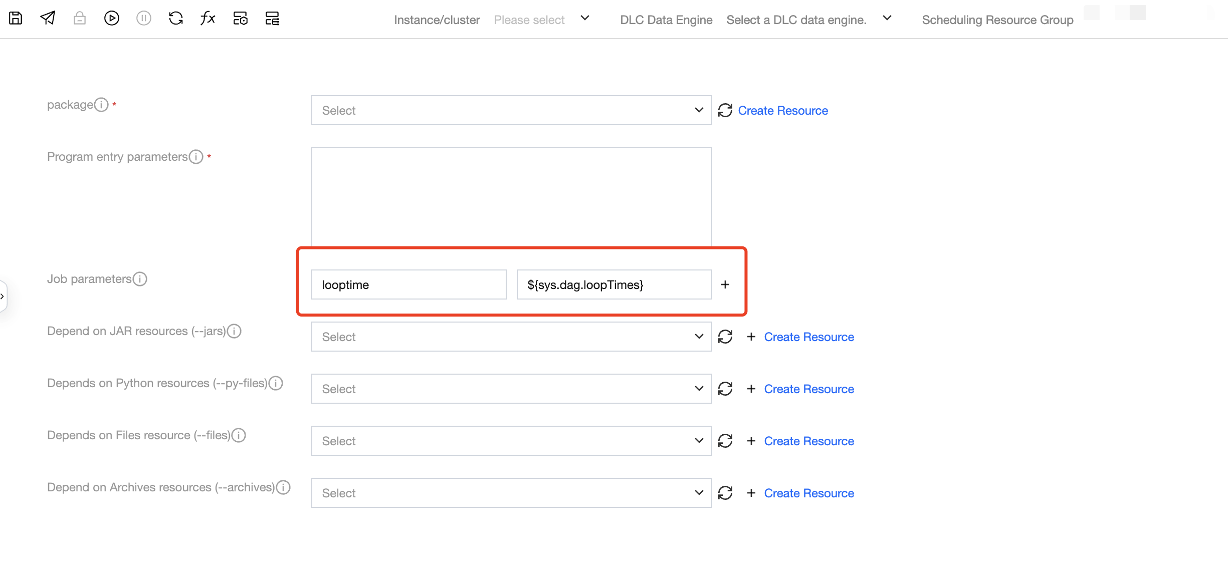 Non-Script Sub-Node | Non-Script Task Node: EMR-Spark, TCHouse-X, DLC Spark, DLC PySpark, MapReduce support the use of built-in variables, with configurable items including: EMR-Spark-jar: program input parameter, application parameter, job parameter. EMR-Spark-zip: execution parameter, application parameter TCHouse-X: program input parameter, job parameter DLC Spark: program entry parameter DLC PySpark: entry parameter, dependent resources, conf parameter MapReduce: output directory, command-line parameters | |