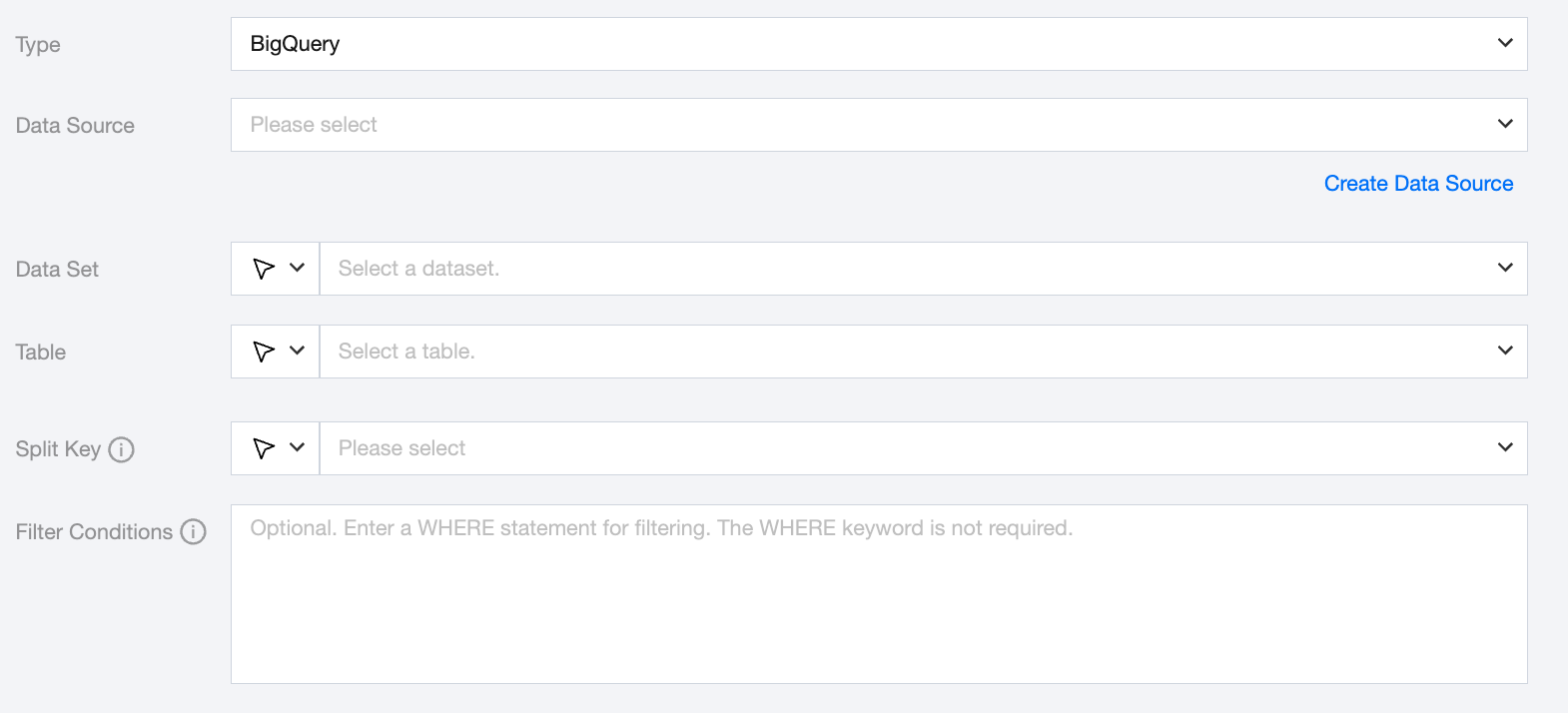 Split Key | Specify the field for data sharding. After specifying, concurrent tasks will be launched for data synchronization. You can use a column in the source data table as the partition key. It is recommended to use the primary key or indexed column as the partition key. Supported split key types: INT64, FLOAT64, TIMESTAMP, BIGNUMERIC, NUMERIC, DATE, DATETIME. |