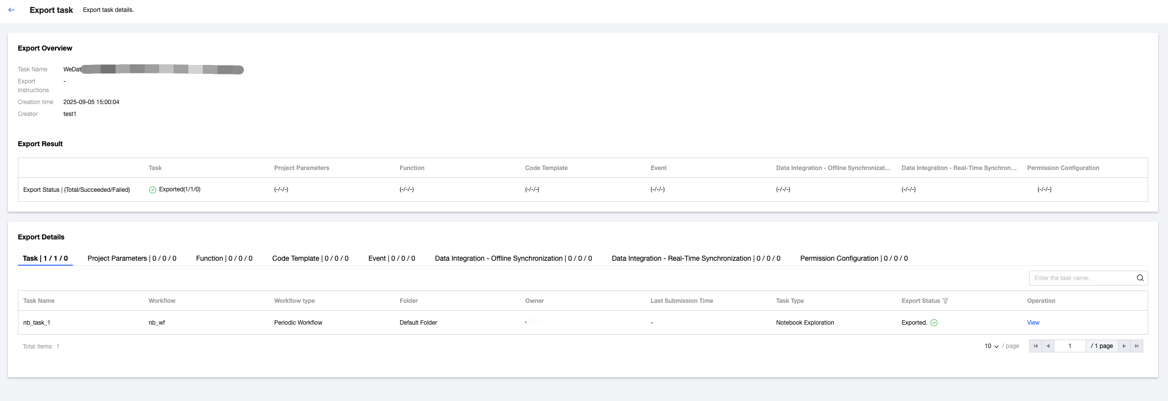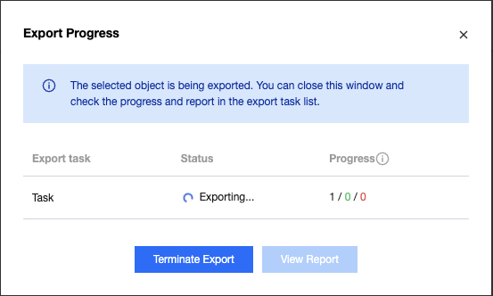 View the export status in the export result, including export successful, export failure, and partially successful. You can view the total count, number of successes, and failure count separately.