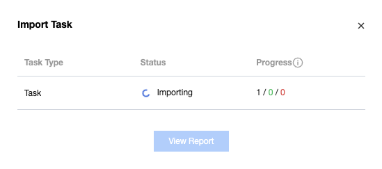 View the import status in the import result, including successful import, import failure, and partially successful. You can view the total count, number of successes, and failure count separately.